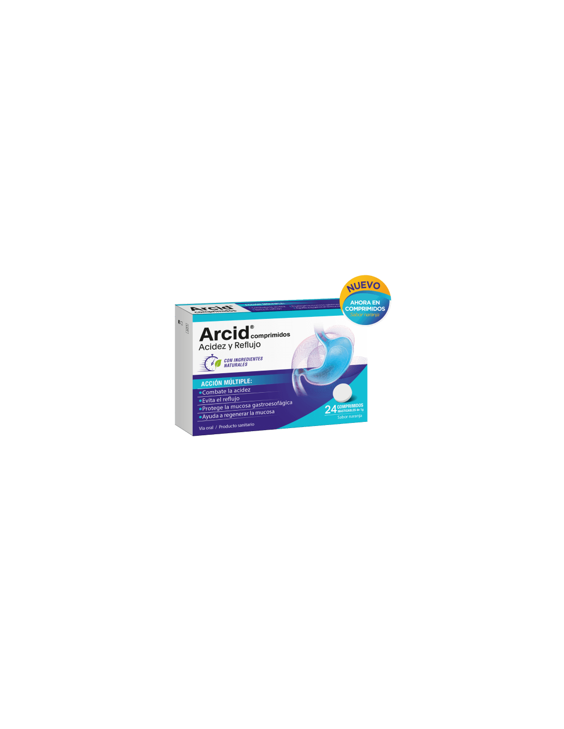 ARCID Comprimidos Masticables contienen ingredientes activos que proporcionan un alivio rápido y efectivo de la acidez y el reflujo gástrico. Cada comprimido incluye carbonato de calcio, que trabaja para neutralizar el ácido estomacal y proteger la mucosa gástrica. Además, el producto contiene edulcorantes y saborizantes naturales de naranja para un sabor agradable. La fórmula está libre de azúcar, lo que la hace adecuada para personas que buscan controlar su ingesta calórica o mantener una dieta equilibrada. Estos comprimidos son una opción segura y efectiva para el manejo de la acidez estomacal ocasional.