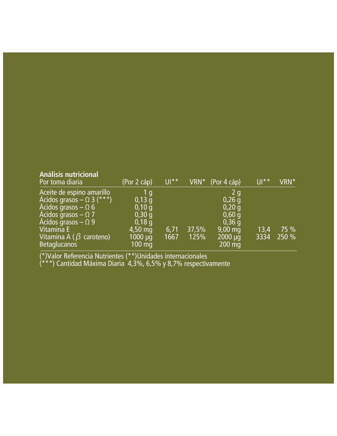 VITAE OlioVita Gastro Cápsulas contiene: Contenido (Aceite de espino amarillo (Hippophae rhamnoides), betaglucanos), cápsula (gelatina de almidón tapioca, humectante (glicerina vegetal), agua).
