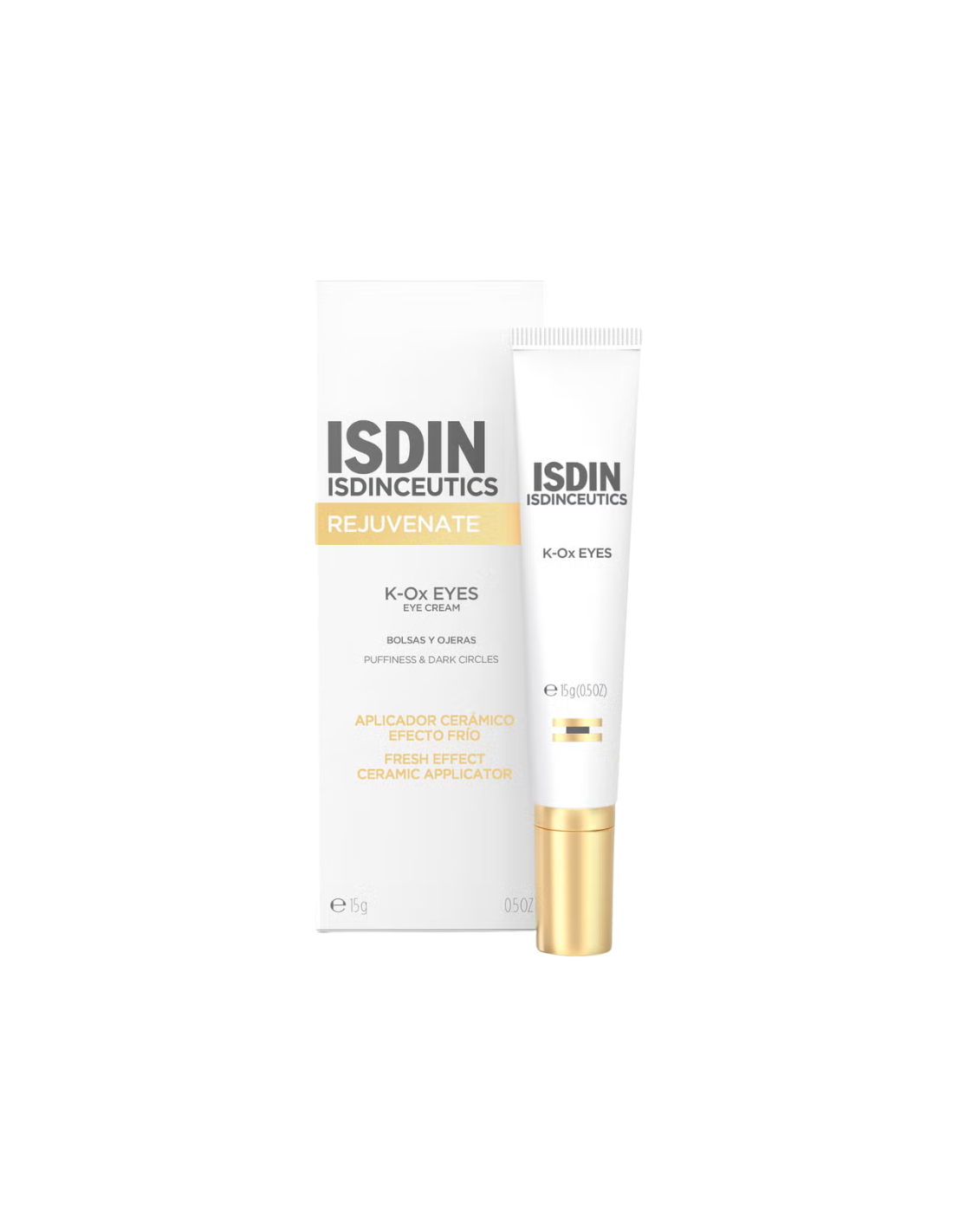 ISDIN Isdinceutics Rejuvenate K-Ox Eyes es un tratamiento específico para el contorno de ojos diseñado para reducir signos visibles del envejecimiento periocular, en especial las líneas de expresión, arrugas, bolsas y ojeras. Su fórmula avanzada actúa sobre los signos estáticos y dinámicos de la zona más delicada del rostro, aportando un efecto refrescante y tensor inmediato, con una mejora progresiva de la firmeza, luminosidad y textura de la piel. Ideal para pieles fatigadas que buscan un contorno más suave, descansado y rejuvenecido, este producto combina ingredientes seleccionados que actúan sinérgicamente para minimizar la apariencia de los signos de la edad.