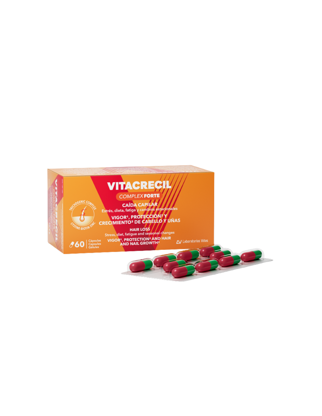 VITACRECIL Complex Forte Caída Capilar Cápsulas es un complemento alimenticio avanzado diseñado para combatir la caída del cabello y fortalecer uñas, ideal para adultos que experimentan debilitamiento capilar debido a estrés, dietas desequilibradas, fatiga, cambios estacionales o déficits nutricionales. Este suplemento nutre el folículo piloso, estimula el crecimiento del cabello, mejora su vigor y densidad, y fortalece las uñas quebradizas. Se integra fácilmente en rutinas diarias de cuidado personal para promover un cabello más fuerte, brillante y saludable, así como uñas resistentes, siendo perfecto para quienes buscan una solución integral y natural para la caída capilar reaccional o estacional.