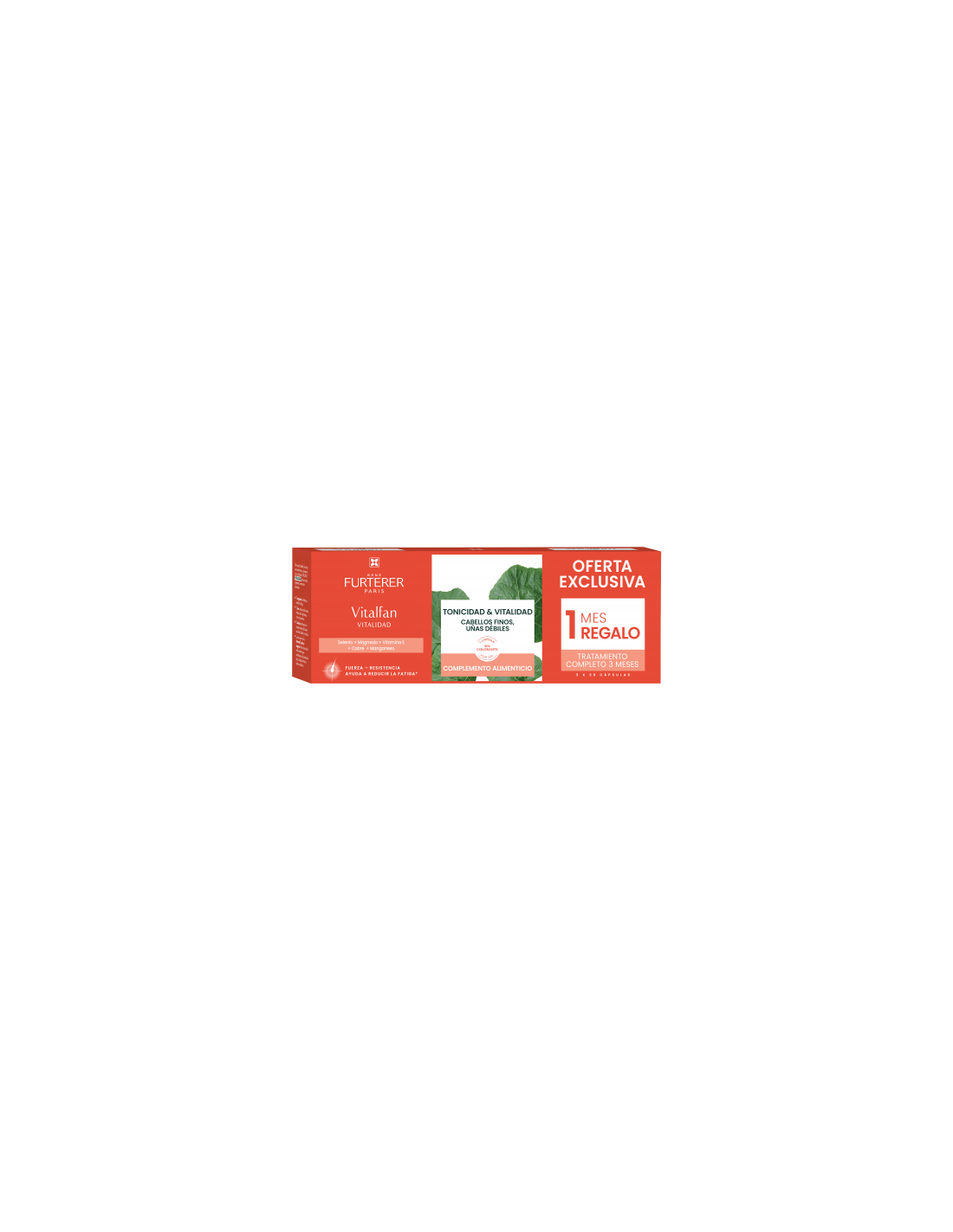 Rene Furterer Vitalfan Vitalidad Cabello y Uñas asocia activos vegetales y aporta vitamina B8 y oligoelementos (selenio y zinc). El pelo y las uñas conservan su vigor y vitalidad. Su aspecto es saludable y atractivo. El consumo debe acompañarse de una alimentación variada y equilibrada y un estilo de vida saludable.