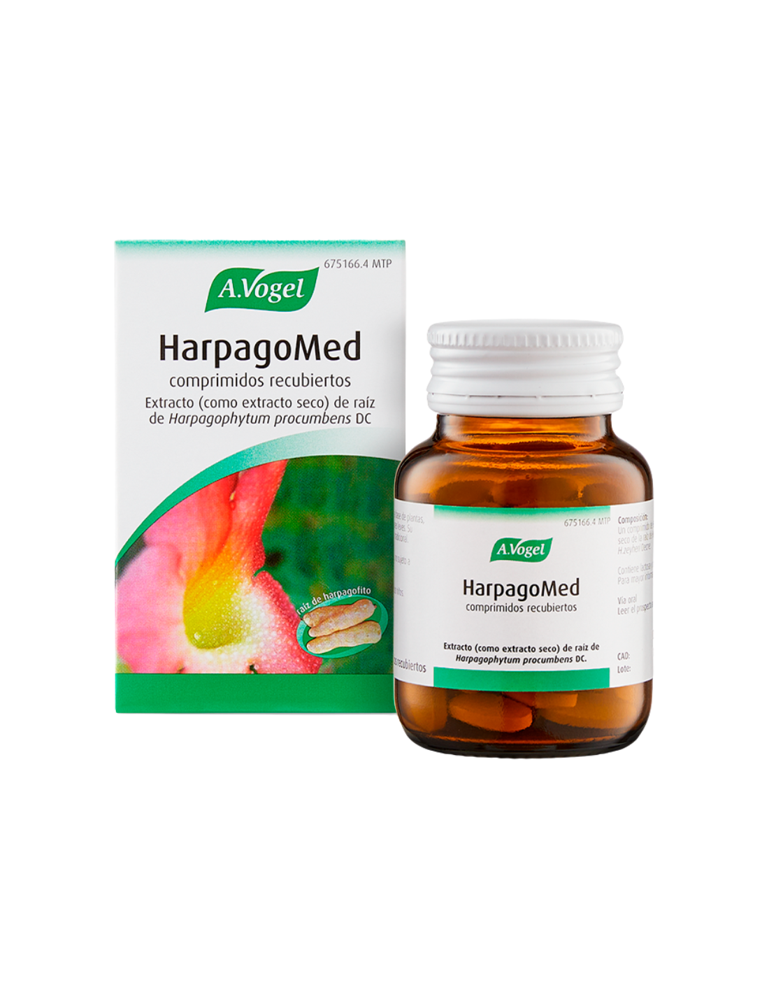 A.VOGEL HarpagoMed Comprimidos Recubiertos contiene extracto seco de raíz de harpagofito (Harpagophytum procumbens y/o Harpagophytum zeyheri), con una cantidad de 480 mg por comprimido, equivalente a 720-1440 mg de raíz de garra del diablo. Incluye además excipientes como lactosa, almidón de maíz, celulosa microcristalina, sílice precipitada y coloidal y estearato magnésico. El recubrimiento del comprimido contiene talco, dióxido de titanio, macrogol e hidroximetilcelulosa.