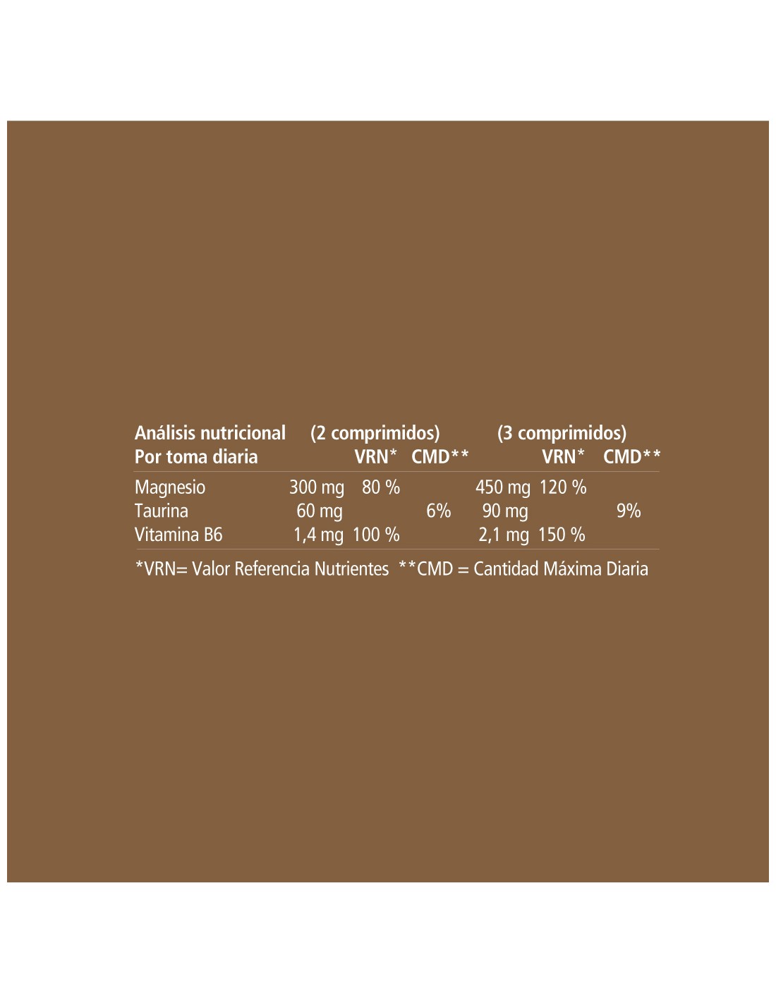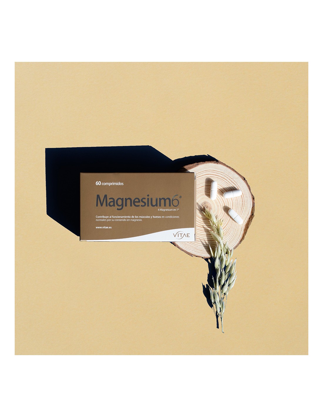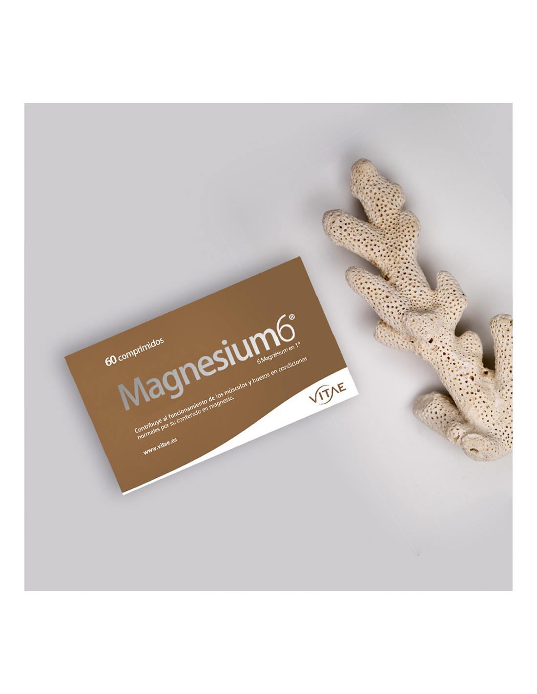 VITAE Magnesium6 Comprimidos contiene: Antiaglomerante (celulosa microcristalina), glicerofosfato de magnesio, bisglicinato de magnesio, óxido de magnesio -marino-, antiaglomerante (fosfato tricálcico), citrato de magnesio, L-pidolato de magnesio, lactato de magnesio, L-taurina, agente de recubrimiento (hidroxipropilmetilcelulosa, celulosa microcristalina, ácido esterárico), antiaglomerante (sales de magnesio de ácidos grasos), clorhidrato de piridoxina (vitamina B6).