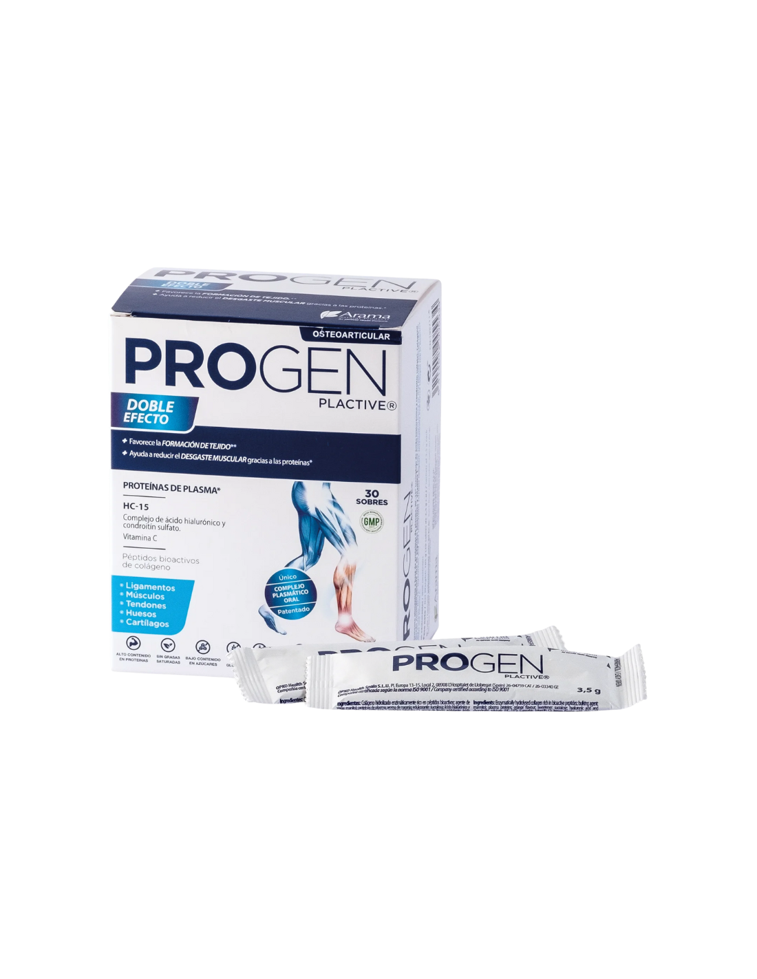 PROGEN Plactive Doble Efecto Sobres es un complemento alimenticio en polvo para reconstituir de doble acción, formulado para favorecer la formación de tejido conectivo y ayudar a reducir el desgaste muscular, ideal para adultos activos, deportistas o personas con molestias articulares que buscan un soporte natural para la recuperación y el mantenimiento de ligamentos, músculos, tendones, huesos y cartílagos. Esta solución concentrada promueve la regeneración tisular, mejora la elasticidad y fortalece la estructura muscular, siendo perfecta para rutinas de entrenamiento intenso o recuperación post-lesión. Se integra fácilmente en batidos o bebidas para un bienestar articular y muscular óptimo.