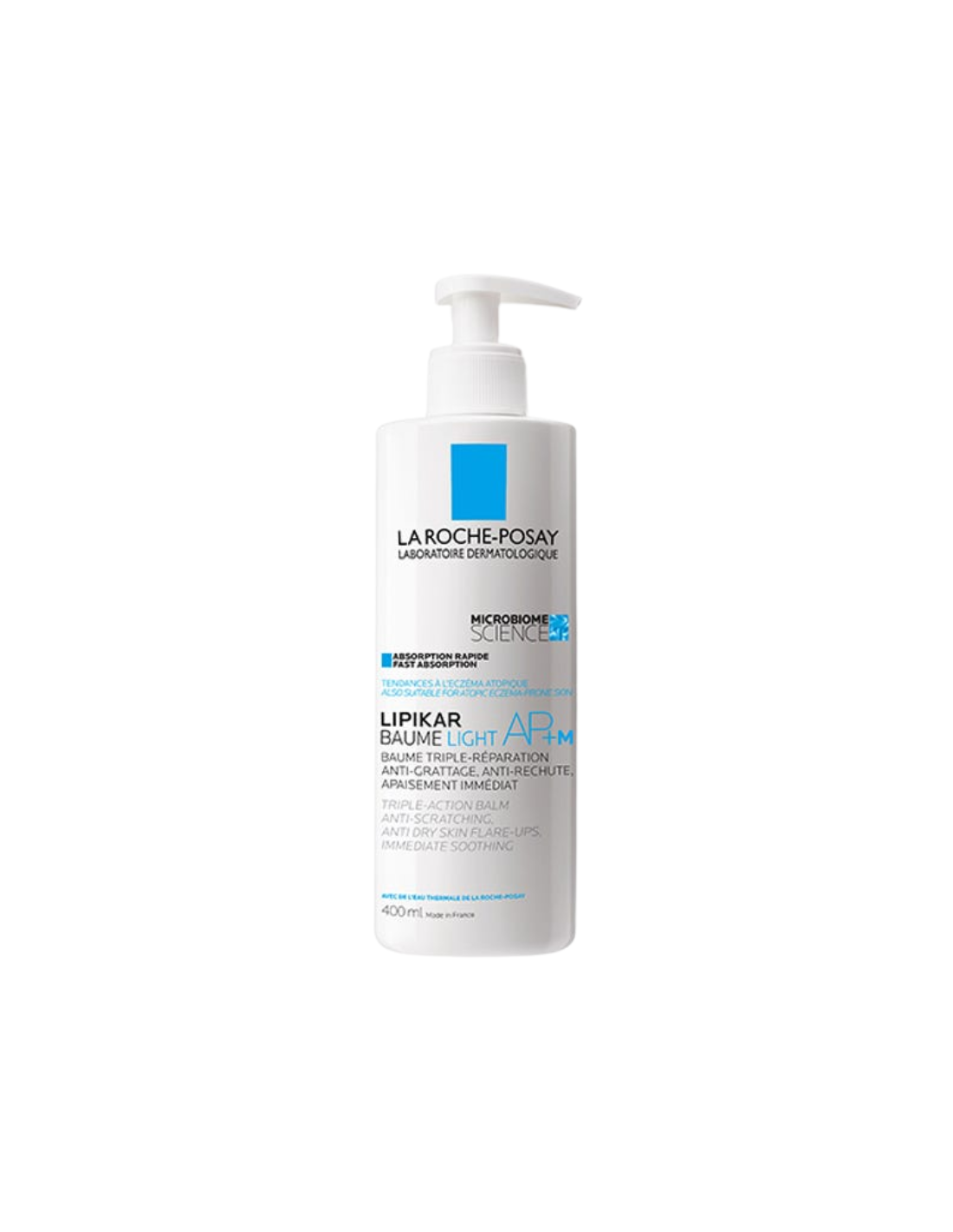 LA ROCHE-POSAY Lipikar Baume Light AP+M es un bálsamo corporal ligero y de rápida absorción especialmente formulado para pieles atópicas, secas, muy secas o irritadas de toda la familia, incluidos bebés desde el nacimiento. Esta textura ligera relipida la piel, restaura la barrera cutánea, alivia el picor intenso y reduce rojeces y tirantez, previniendo las recaídas de eccema atópico. Fortalece la barrera, equilibra la microbiota, proporciona hasta 48 horas de hidratación y confort inmediato sin sensación pesada. Testado dermatológica y pediátricamente, sin perfume, sin parabenos y con pH fisiológico, es ideal para rutinas diarias en pieles sensibles o con necesidades de reparación ligera y no grasa.