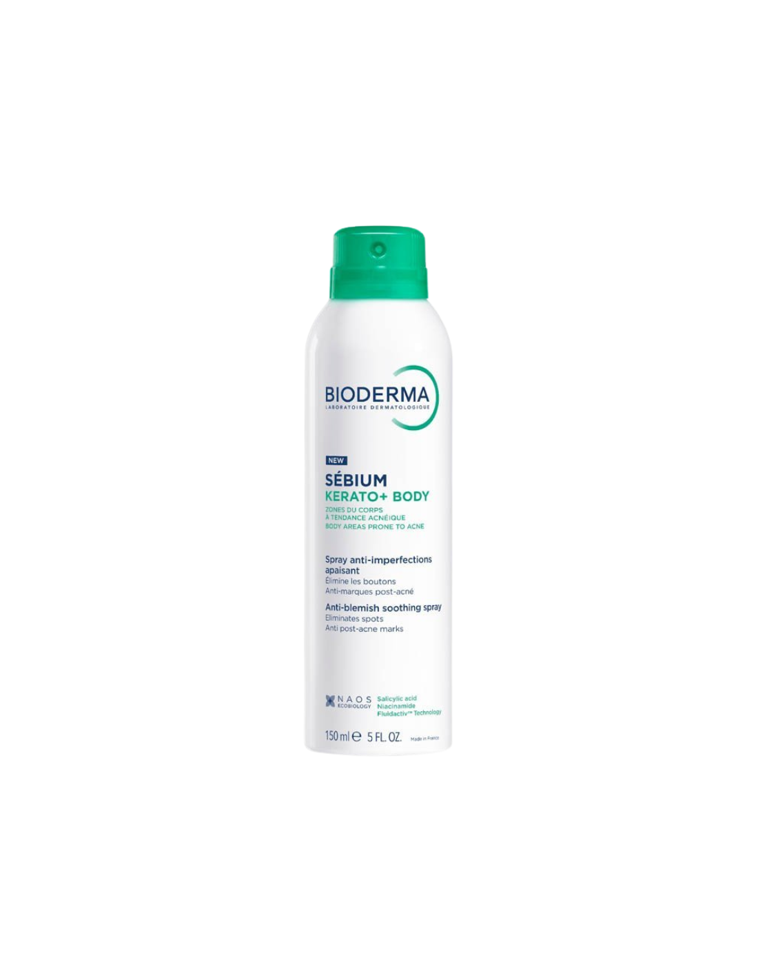 BIODERMA Sébium Kerato+ Body Spray es un tratamiento en spray diseñado para pieles grasas o con tendencia acneica en el cuerpo, ideal para adolescentes y adultos que buscan reducir imperfecciones, como espinillas, puntos negros y marcas, en áreas como espalda, pecho o brazos. Este spray exfolia suavemente, desobstruye los poros, regula el exceso de sebo y calma las irritaciones, mejorando la textura de la piel en solo dos días. Su fórmula ligera, no grasa y no comedogénica hidrata y proporciona un efecto refrescante, siendo perfecta para el uso diario. Este producto se integra fácilmente en la rutina de cuidado corporal, promoviendo una piel más clara, suave y equilibrada.