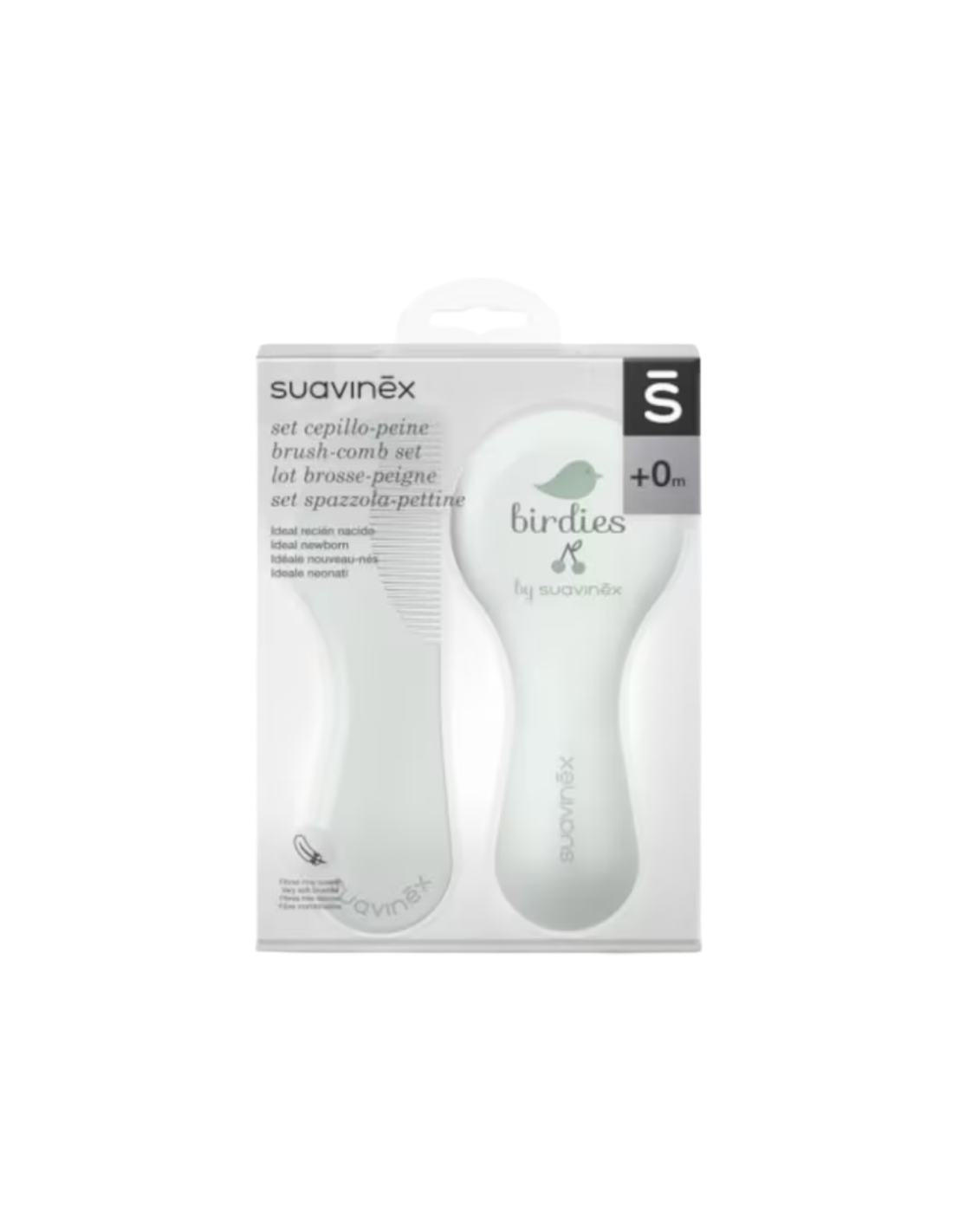 SUAVINEX Set Cepillo-Peine Verde +0 Meses es un conjunto diseñado especialmente para cuidar el cabello de los bebés desde su nacimiento. Con una combinación de un cepillo suave y un peine de diseño ergonómico, este set proporciona un cuidado delicado para el cuero cabelludo sensible del bebé. El cepillo está diseñado con cerdas suaves que no irritan la piel, mientras que el peine facilita desenredar suavemente el cabello, promoviendo una experiencia cómoda tanto para el bebé como para los padres. Ideal para bebés recién nacidos y hasta los 6 meses de edad.