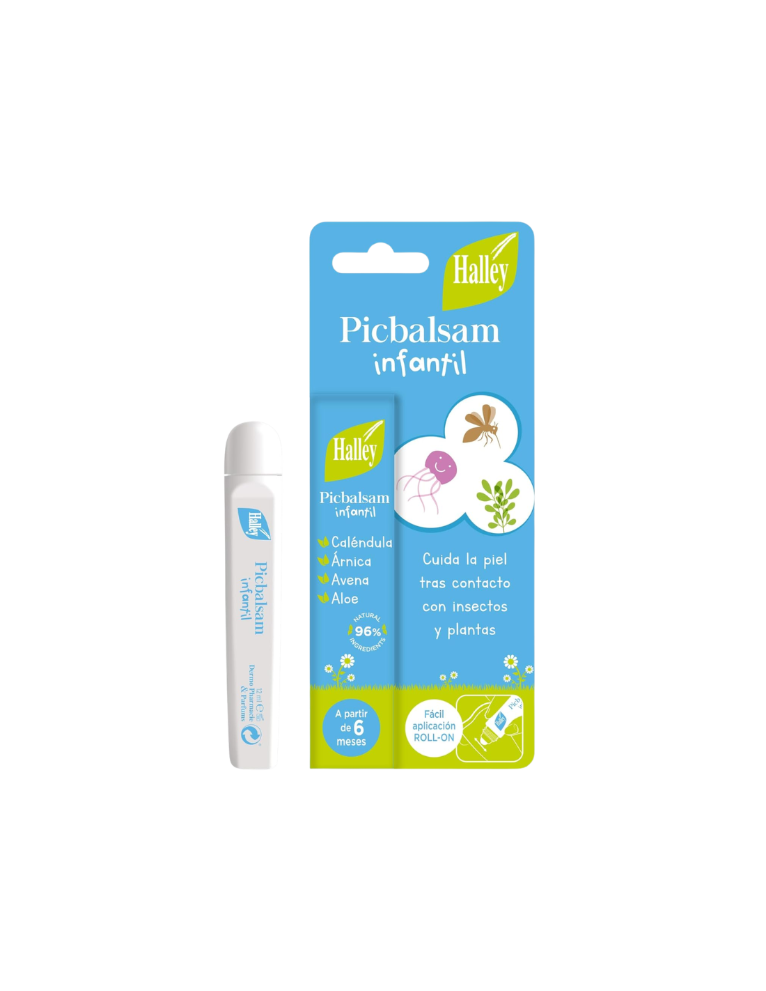 HALLEY Pack Infantil contiene un repelente formulado con extracto natural de Pyrethrum (piretro), un activo de origen vegetal que actúa desorientando a los insectos y manteniéndolos alejados, junto con piperonil butóxido que potencia su eficacia. El bálsamo calmante incluye ingredientes como aloe vera, caléndula, árnica y avena, conocidos por sus propiedades calmantes, antiirritantes y regeneradoras de la piel, ayudando a aliviar el picor y favorecer la recuperación cutánea tras la picadura.