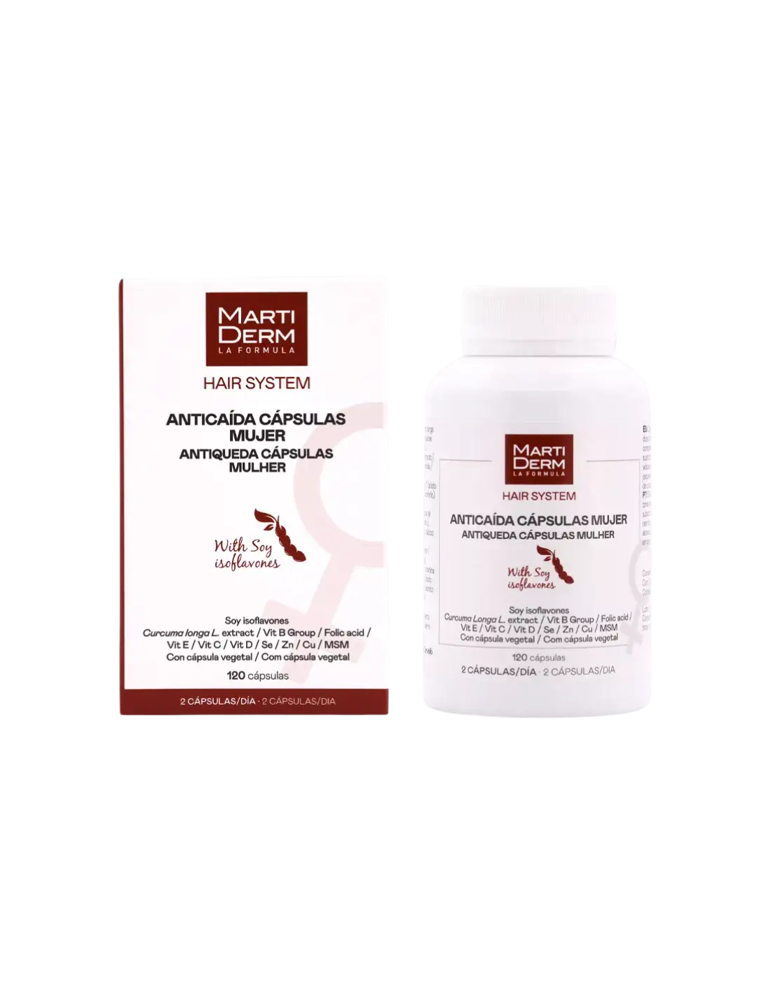 MARTIDERM Hair System Anticaída Mujer contiene: Isoflavonas de soja, Curcumina, Metilsulfonilmetano, Vitamina B2 - Riboflavina, Vitamina B3 - Nicotinamida, Vitamina B5 - Á. Pantoténico, Vitamina B6 - Piridoxina, Vitamina B8 - Biotina, Vitamina B9 - Ácido fólico, Vitamina B12 - Cianocobalamina, Selenio, Zinc, Cobre, Vitamina C, Vitamina E - Tocoferol.