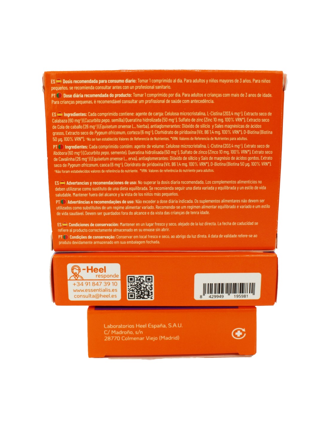 Cada comprimido contiene: agente de carga: Celulosa microcristalina, L-Cistina (203,4 mg), Extracto seco de Calabaza (60 mg) (Cucurbita pepo, semilla) Queratina hidrolizada (50 mg), Sulfato de zinc (Zinc 10 mg, 100% VRN*), Extracto seco de Cola de caballo (26 mg) (Equisetum arvense L., hierba), antiaglomerantes: Dióxido de silicio y Sales magnésicas de ácidos grasos, Extracto seco de Pygeum africanum, corteza (6 mg), Clorhidrato de piridoxina (Vit. B6 1,4 mg, 100% VRN*), D-Biotina (Biotina 50 µg, 100% VRN*).