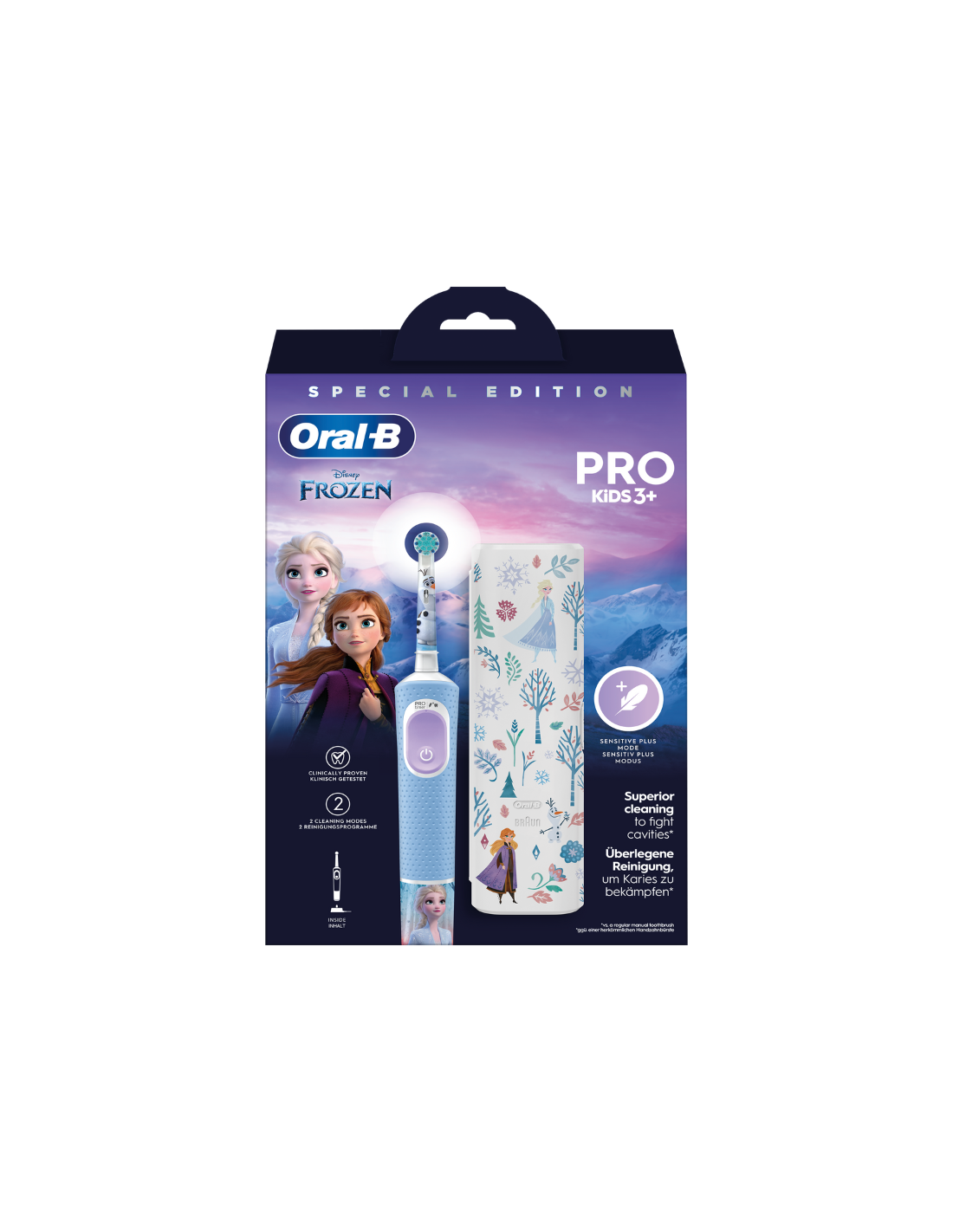Oral-B Cepillo Recargable Pro Kids Box Frozen + Estuche para niños mayores de 3 años combina la diversión de Frozen con la limpieza suave y eficaz de un cepillo de dientes Oral-B recomendado por dentistas. Con 2 modos de cepillado que incluyen un modo sensible único para niños, este cepillo limpia los dientes con suavidad. Elimina más placa que un cepillo de dientes manual normal.