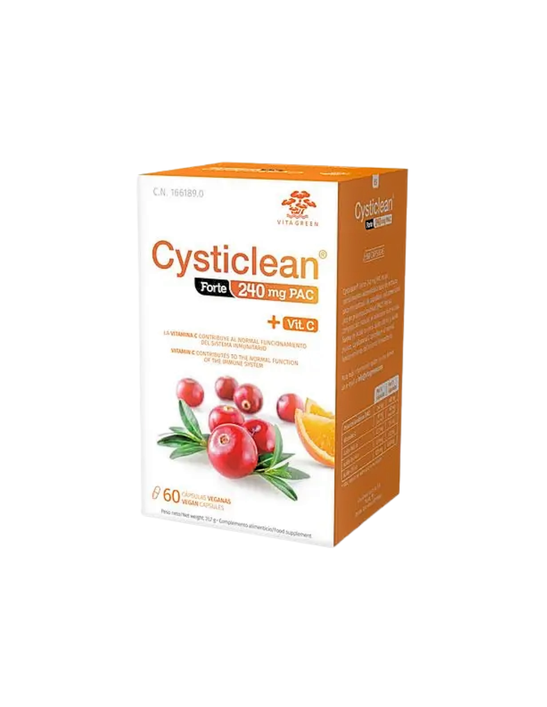 Cysticlean Forte 240mg PAC Cápsulas es un complemento alimenticio vegano de alta concentración diseñado para apoyar la salud del tracto urinario y reforzar el sistema inmunitario, ideal para adultos que buscan una prevención natural de infecciones urinarias recurrentes (ITU) y un bienestar integral. Este producto inhibe la adhesión de bacterias como E. coli a las paredes del tracto urinario, mientras que favorece la acidez urinaria para una eliminación más eficaz. Contribuye al normal funcionamiento del sistema inmunitario, es perfecto para mujeres propensas a cistitis o para el mantenimiento diario de la salud urinaria. Este envase ofrece un suministro para 1-2 meses, integrándose fácilmente en rutinas de bienestar para una protección antioxidante y un tracto urinario saludable.