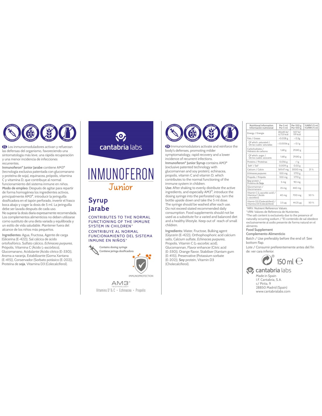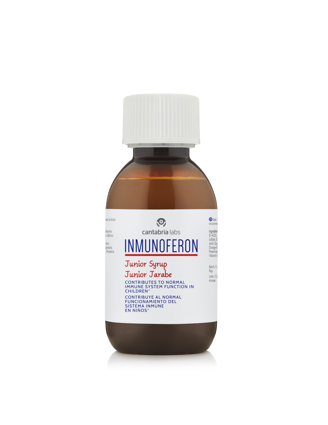 Inmunoferon Junior Jarabe es una fórmula exclusiva para niños a base de la tecnología AM3® (tecnología patentada por Cantabria Labs con glucomanano y proteína de soja) y enriquecido con própolis, equinácea, vitamina C y vitamina D, ingrediente que contribuye al normal funcionamiento del sistema inmune en niños.