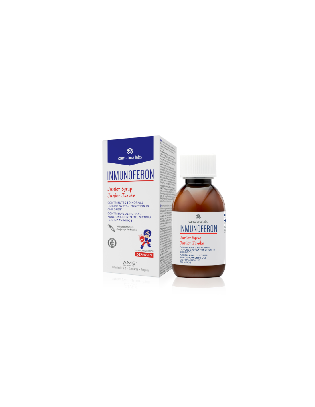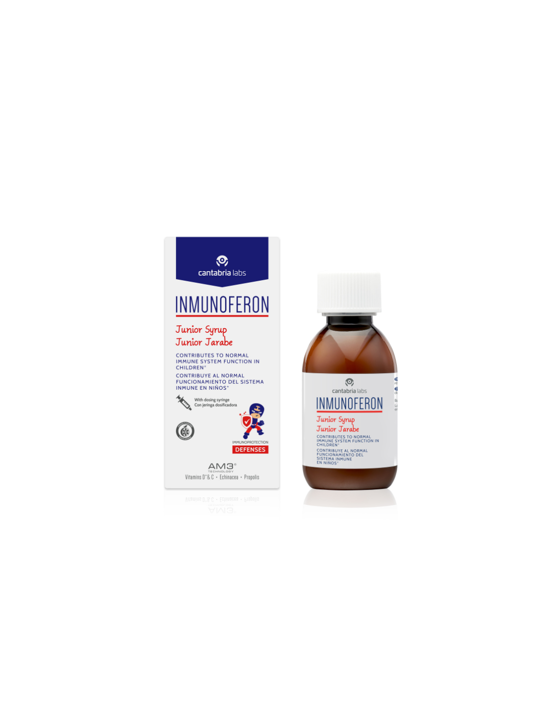 INMUNOFERON Junior Jarabe es una fórmula exclusiva para niños a base de la tecnología AM3® (tecnología patentada por Cantabria Labs con glucomanano y proteína de soja) y enriquecido con própolis, equinácea, vitamina C y vitamina D, ingrediente que contribuye al normal funcionamiento del sistema inmune en niños.