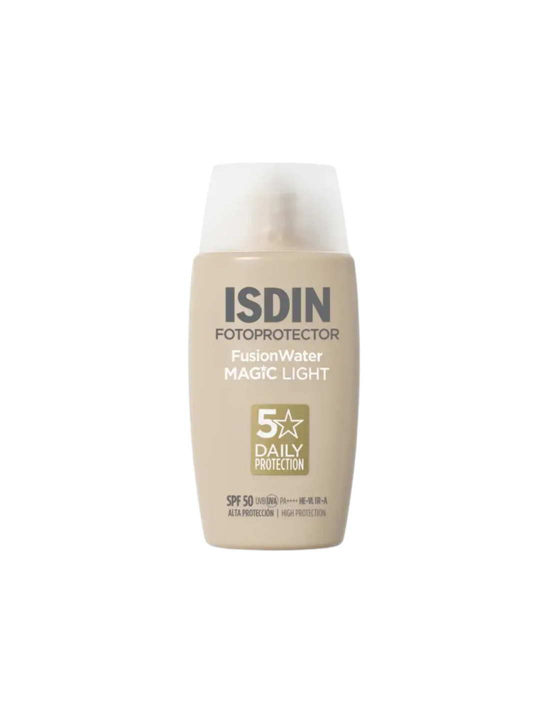ISDIN Fotoprotector Fusion Water Magic Light SPF50 es un fotoprotector facial de uso diario con muy alta protección solar que ayuda a proteger la piel frente a la radiación UVB y UVA, así como frente a otros factores ambientales responsables del fotoenvejecimiento. Su innovadora textura ultraligera de base acuosa se absorbe de forma inmediata, proporcionando un acabado natural sin sensación grasa. Incorpora un ligero tono “Light” que ayuda a unificar el tono de la piel y disimular pequeñas imperfecciones, aportando un efecto de buena cara instantáneo. Además, su fórmula hidratante y antioxidante contribuye a mantener la piel suave y protegida frente a los radicales libres, siendo apta para todo tipo de pieles, incluso mixtas o grasas.