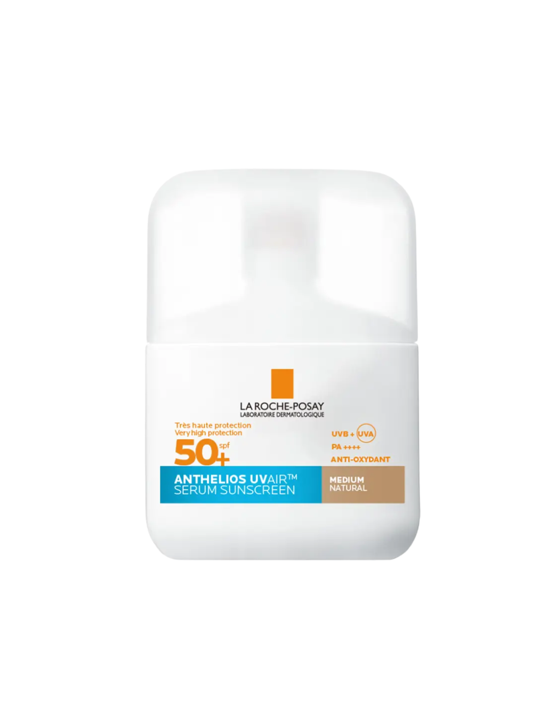 LA ROCHE-POSAY Anthelios UV Air SPF50+ Sérum Protector Solar Medio es un protector solar facial con color, de muy alta protección SPF50+, diseñado para proteger eficazmente la piel del rostro frente a los rayos UVA y UVB durante el uso diario, al tiempo que unifica el tono cutáneo con un acabado ligero y natural. Su fórmula tipo sérum combina textura ultraligera, absorción rápida y acabado invisible, aportando un aspecto saludable y uniforme, sin sensación grasa. Además de proteger contra la radiación solar, ayuda a paliar los efectos nocivos de la polución ambiental y del estrés oxidativo gracias a ingredientes que favorecen la hidratación y el confort, lo que lo convierte en una opción ideal como protección solar diaria, con un beneficio cosmético adicional en el tono.