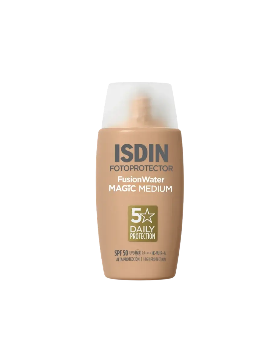 ISDIN Fotoprotector Fusion Water Magic Medium SPF50 es un protector solar facial ultraligero con color medio que ofrece protección muy alta SPF50 Full Spectrum contra rayos UVA, UVB, luz azul, IR-A y polución. Su innovadora textura Fusion Water tipo agua se absorbe al instante sin residuo blanco ni sensación grasa, unificando el tono de la piel de forma natural, disimulando imperfecciones y aportando un efecto buena cara inmediato. Enriquecido con extracto de alga mediterránea de acción antioxidante, ácido hialurónico hidratante y vitamina E, refuerza la barrera cutánea y protege contra el daño oxidativo. Oil-free, no comedogénico e ideal para pieles mixtas y grasas. Hipoalergénico, con Safe Eye Tech que no irrita los ojos y perfecto como base de maquillaje diaria.