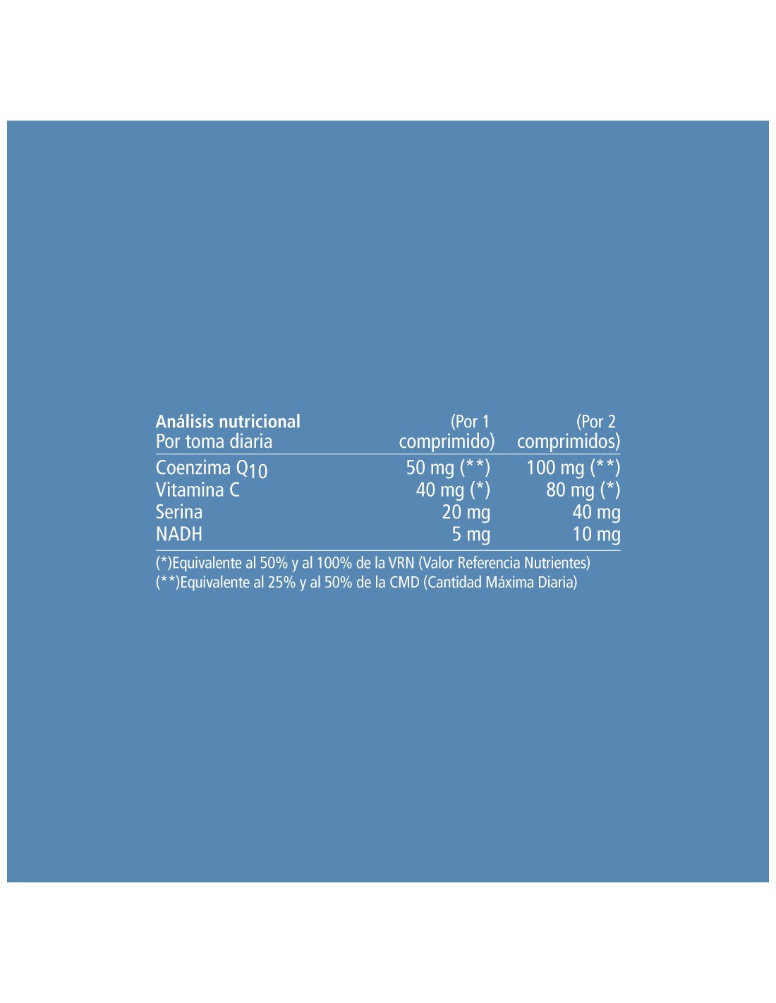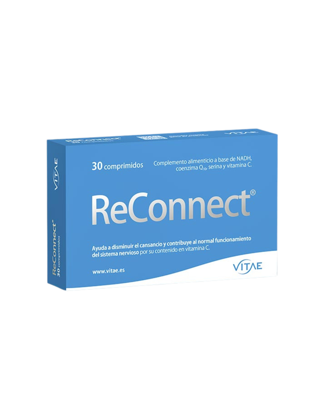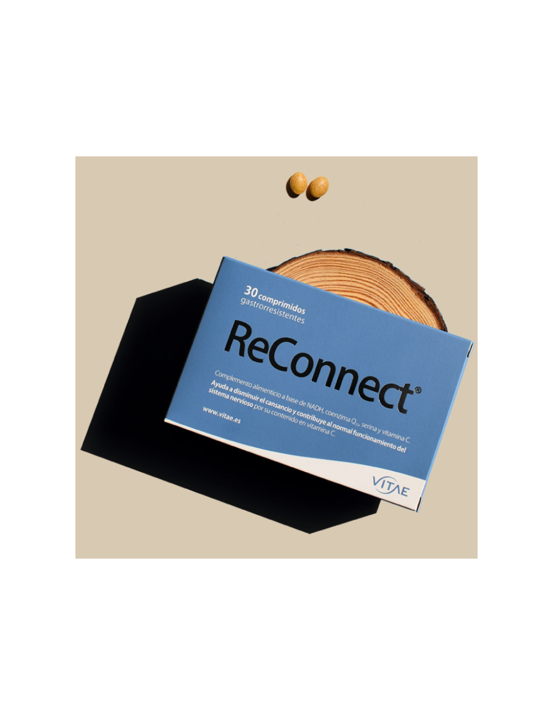 VITAE ReConnect Comprimidos contiene: Agente de carga (celulosa microcristalina), agente de carga (fosfato dicálcico dihidrato), antiaglomerante (talco), coenzima Q10, ascorbato sódico (vitamina C), corrector de acidez (fosfato disódico anhidro), agente de recubrimiento (etilcelulosa), L-serina, agente de recubrimiento (hidroxipropilmetilcelulosa), antiaglomerante (estearato de magnesio), agente de recubrimiento (hidroxipropilcelulosa), NADH, agente de recubrimiento (alginato sódico), estabilizante (triglicéridos de cadena media), colorante (carbonato de calcio).