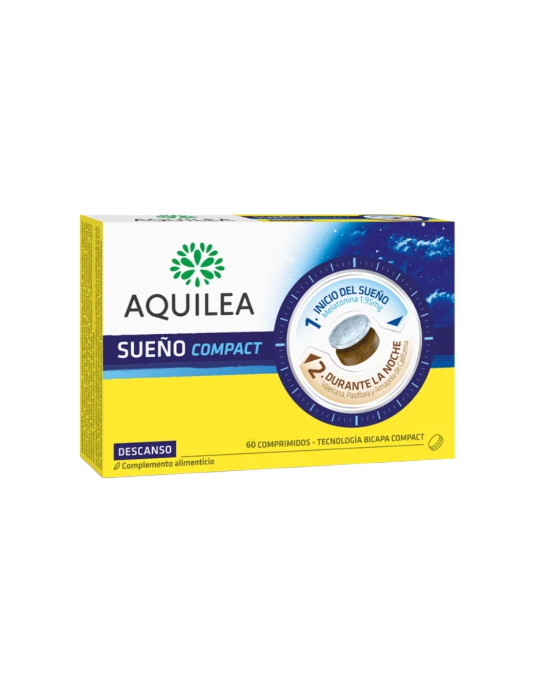 AQUILEA Sueño Compact Comprimidos es un complemento alimenticio formulado para promover un sueño profundo y reparador de forma natural, ideal para personas con dificultades para conciliar el sueño o mantenerlo durante la noche. Su innovadora tecnología bicapa libera los ingredientes de manera progresiva: la primera capa ayuda a iniciar el sueño rápidamente, mientras que la segunda capa favorece un descanso continuo. Este producto es apto para adultos y adolescentes a partir de 12 años, ofreciendo una solución natural para combatir el insomnio ocasional causado por estrés, ansiedad o cambios de horario, sin provocar adicción ni somnolencia residual.