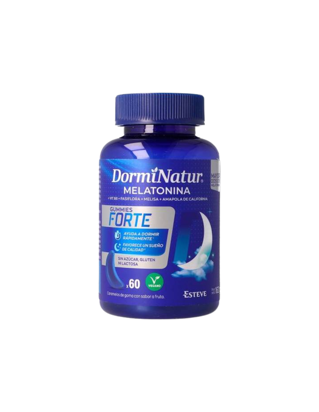 DORMINATUR Melatonina Forte Gummies es un complemento alimenticio en deliciosos caramelos de goma con sabor a fruta que ayuda a conciliar el sueño rápidamente y favorece un sueño de mayor calidad y reparador. Cada gummy contiene 1,85 mg de Melatonina, Vitamina B6, extracto de Pasiflora y extracto de Amapola de California, ingredientes que actúan de forma sinérgica para promover la relajación natural y regular el ciclo sueño-vigilia. Ideal para personas con dificultades para dormir, estrés ocasional o jet lag. Sin azúcar, gluten ni lactosa, su fórmula es apta para veganos y agradable al consumir. La textura suave y el rico sabor a fruta hacen que tomarlo sea un momento placentero antes de ir a la cama. Recomendado para mejorar el descanso nocturno de forma cómoda y efectiva.