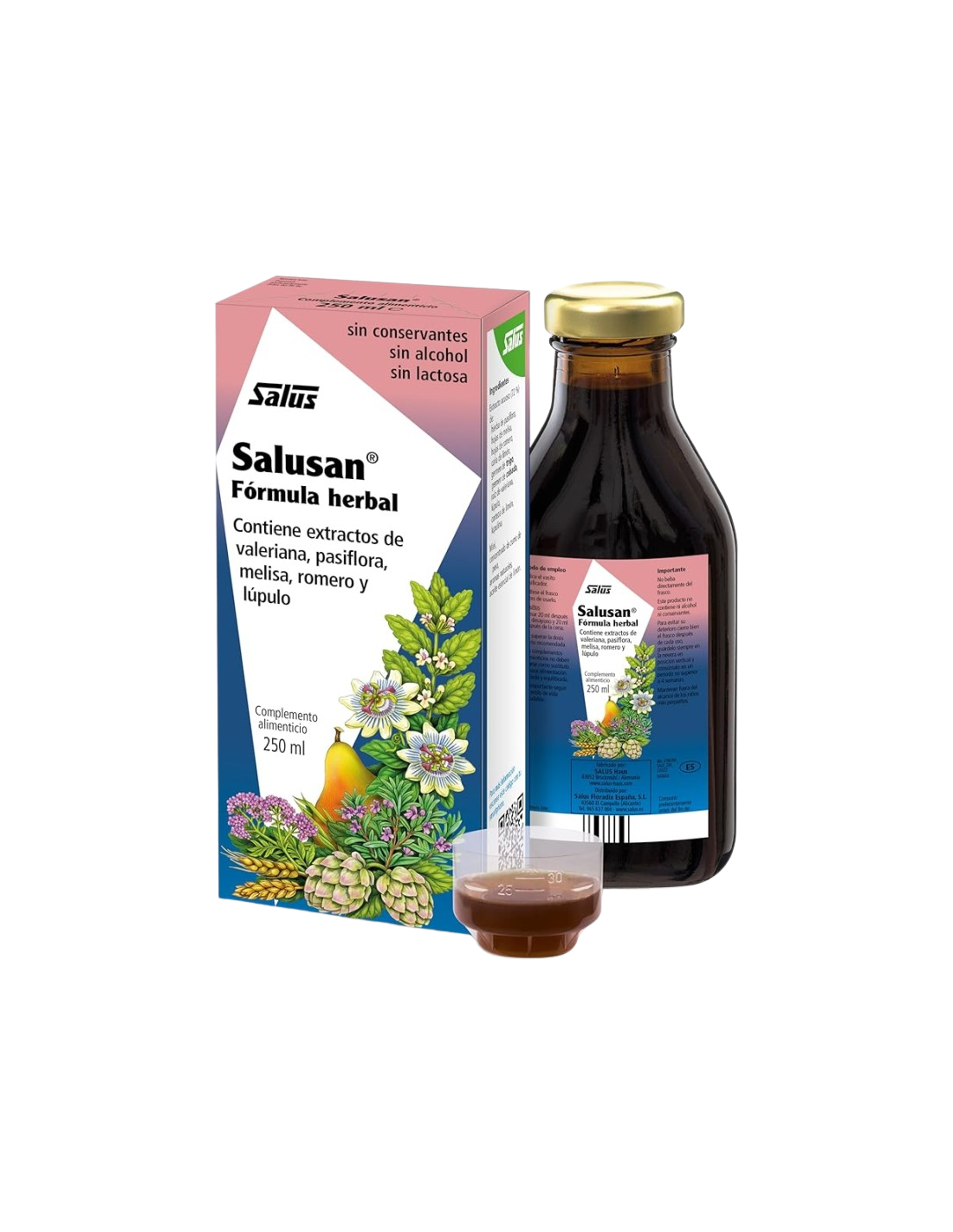 SALUS Salusan Fórmula Herbal es un complemento alimenticio líquido a base de extractos herbales diseñado para promover la relajación y ayudar a conciliar el sueño de forma natural. Formulado con una combinación sinérgica de plantas como pasiflora (que favorece la relajación), melisa (que contribuye al bienestar mental y al sueño), valeriana (que ayuda a mantener un sueño reparador), romero, lúpulo y otros ingredientes herbales que actúan en conjunto para reducir el estrés diario y mejorar la calidad del descanso nocturno. Ideal para adultos con dificultades para dormir o con tensión ocasional, su formato líquido facilita la absorción y ofrece un sabor agradable gracias a la miel y a los zumos naturales.