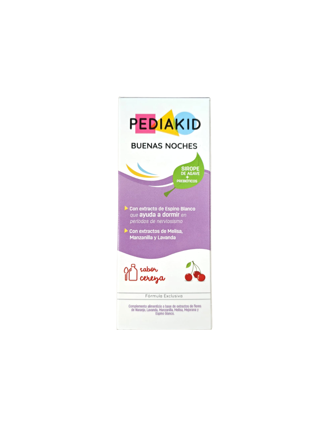 AQUILEA Pediakid Buenas Noches contiene sirope de agave como base natural, prebióticos y una combinación de extractos vegetales como flores de naranjo, lavanda, manzanilla, melisa, mejorana y espino blanco, conocidos por sus propiedades calmantes y relajantes. Además, incorpora aroma natural de cereza que mejora su sabor, facilitando su consumo por parte de los niños.