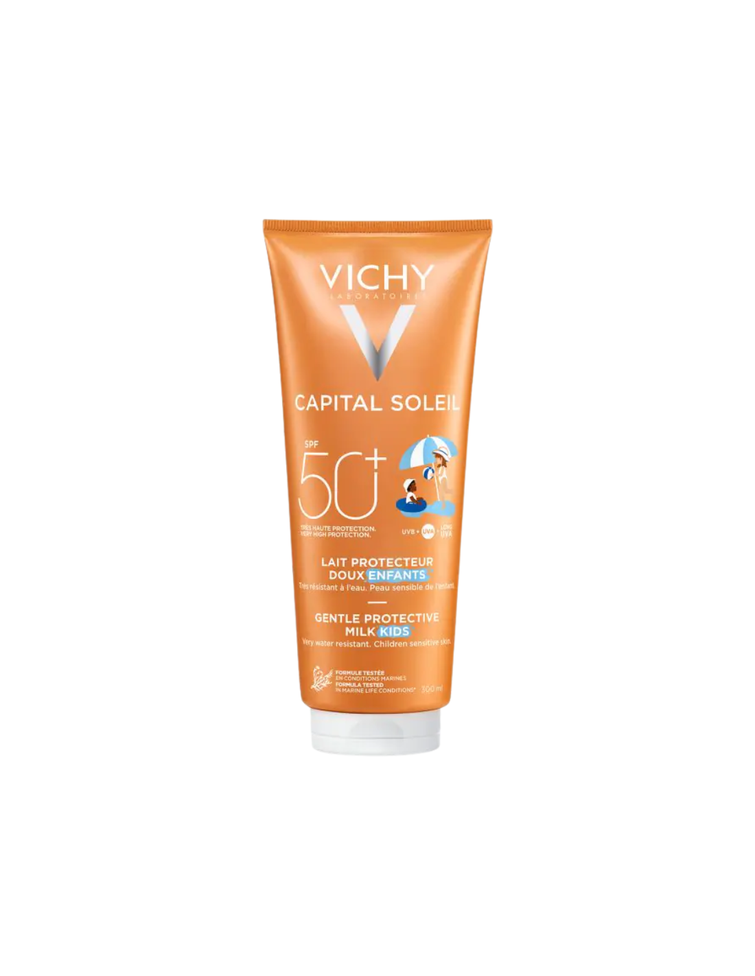 VICHY Capital Soleil SPF50+ Leche Protectora Niños es una leche solar infantil de muy alta protección (SPF50+), formulada específicamente para las pieles sensibles de los niños. Proporciona protección avanzada frente a los rayos UVB y UVA, ayudando a prevenir las quemaduras solares y el daño cutáneo inducido por la radiación solar. Su textura en leche fluida facilita una aplicación uniforme tanto en el rostro como en el cuerpo, aportando hidratación y confort sin dejar sensación pegajosa. Gracias a su fórmula desarrollada para la piel infantil delicada, ofrece una muy alta resistencia al agua. Ideal para la playa, la piscina y las actividades al aire libre. Testada bajo control dermatológico y pediátrico, es hipoalergénica y adecuada para el uso frecuente durante la exposición solar.