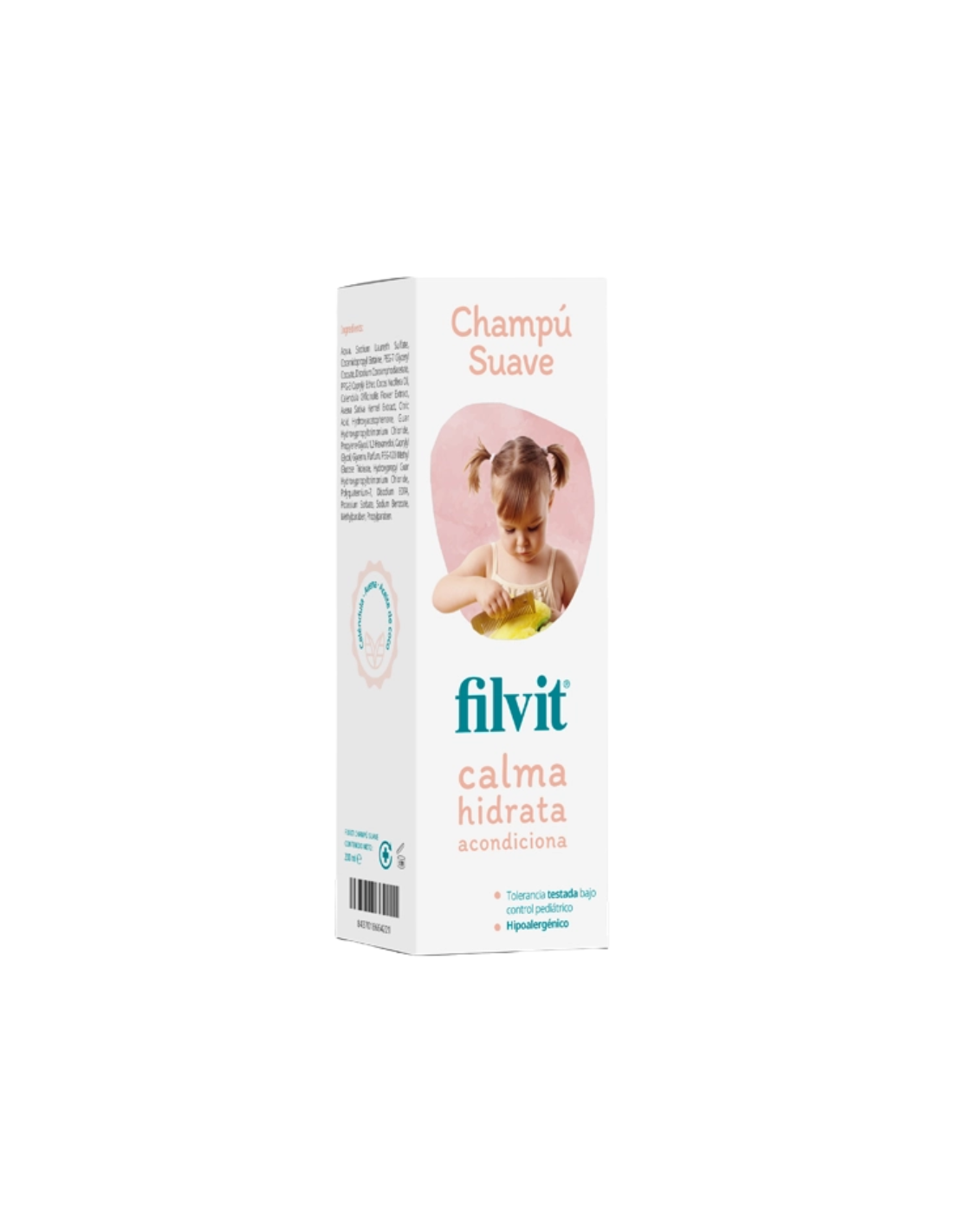 FILVIT Champú Suave es un champú especialmente formulado para el cuidado diario del cabello infantil, diseñado para limpiar con suavidad mientras calma el picor y protege el cuero cabelludo sensible. Su fórmula hipoalergénica y testada bajo control pediátrico incorpora ingredientes de origen natural como la avena y la caléndula, conocidos por sus propiedades calmantes, junto con aceite de coco que ayuda a acondicionar el cabello. Este champú sin jabón ni agentes agresivos hidrata, facilita el peinado y evita los enredos, dejando el cabello suave, brillante y con un agradable aroma, sin provocar irritación ni lágrimas durante su uso.