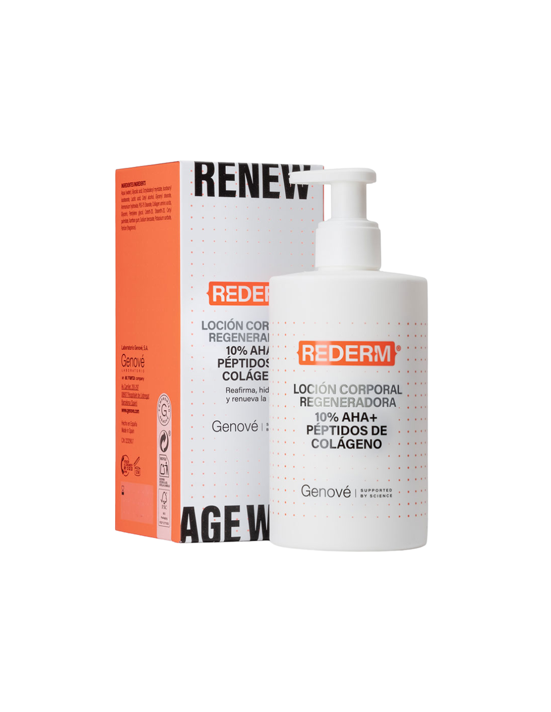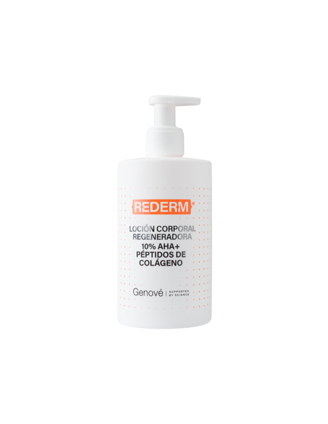 REDERM Loción Corporal Regeneradora 10% AHA + Péptidos de Colágeno es un tratamiento corporal intensivo diseñado para renovar, hidratar y mejorar la calidad de la piel en zonas fotoenvejecidas, secas o rugosas. Su fórmula combina un 10% de alfahidroxiácidos (AHA) con péptidos de colágeno para favorecer la exfoliación suave, estimular la regeneración celular y mejorar la firmeza y la elasticidad de la piel. Ayuda a alisar la textura, unificar el tono y aportar luminosidad, siendo ideal para áreas como codos, rodillas, escote o brazos, así como para pieles con queratosis pilaris o con falta de firmeza.