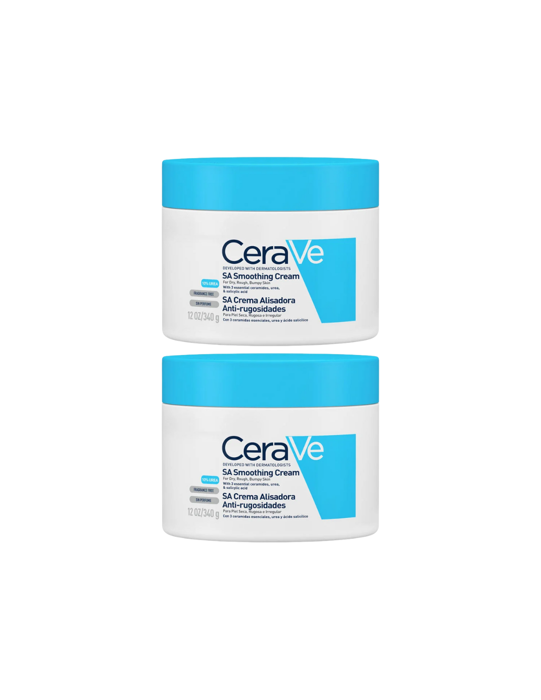 CeraVe Duplo SA Crema Alisadora Anti-Rugosidades es un pack dúo de crema corporal rica y no grasa que suaviza, alisa e hidrata intensamente pieles secas, rugosas e irregulares, como aquellas con queratosis pilar o "piel de gallina". Formulada con ácido salicílico y LHA (ácido capriloil salicílico) para una exfoliación gentil, urea al 10% para retener humedad y eliminar células muertas, niacinamida calmante y 3 ceramidas esenciales (NP, AP, EOP) que restauran la barrera cutánea. Con tecnología MVE para hidratación prolongada hasta 24 horas y ácido hialurónico, ofrece resultados visibles en textura suave y uniforme sin irritaciones. Ideal para el cuerpo (brazos, piernas, codos) en pieles sensibles o secas.
