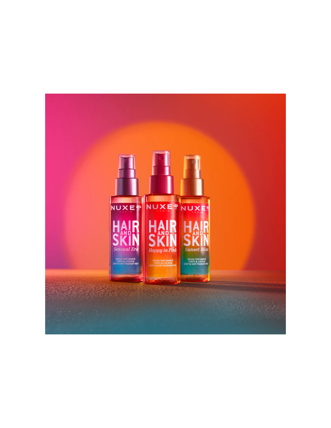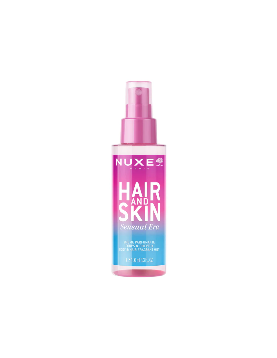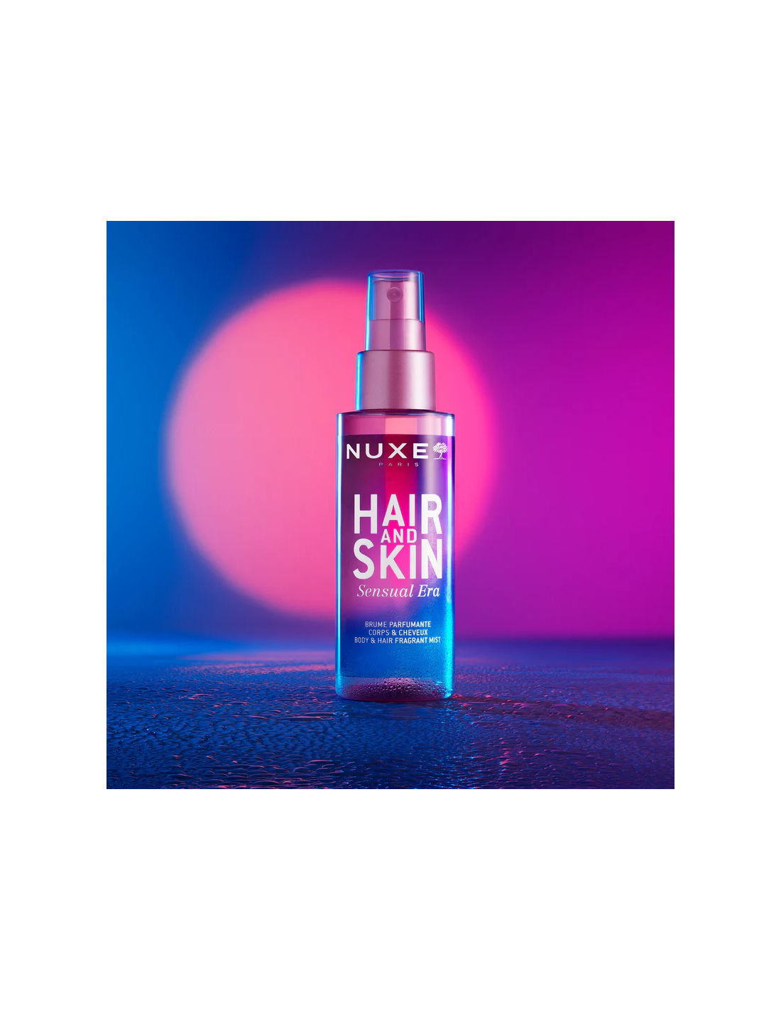 NUXE Hair and Skin Sensual Era Bruma Perfumada es una bruma ligera y sofisticada diseñada para perfumar delicadamente tanto la piel como el cabello con una fragancia cálida, sensual y envolvente. Inspirada en los rituales de belleza más elegantes, combina notas adictivas que aportan un aroma duradero sin resultar pesado, proporcionando una experiencia sensorial única. Su fórmula ligera no reseca y deja un velo perfumado sutil que realza la feminidad, siendo ideal para usar en cualquier momento del día como toque final de la rutina de cuidado personal.