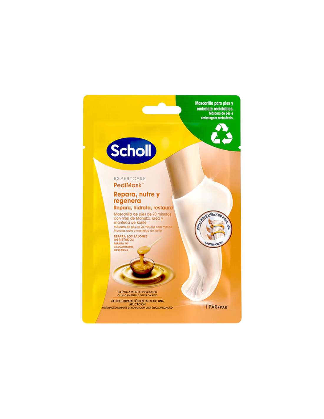Scholl Pedimask Miel de Manuka Repara, Nutre y Protege contiene extracto de miel de Manuka, conocido por sus propiedades nutritivas, antioxidantes y calmantes, urea, un agente hidratante que favorece la retención de agua en la piel seca, manteca de karité, rica en ácidos grasos que nutren y suavizan, y otros activos como pantenol y aceite de macadamia que apoyan la reparación y confort cutáneo profundo para pies visiblemente más suaves y cuidados.