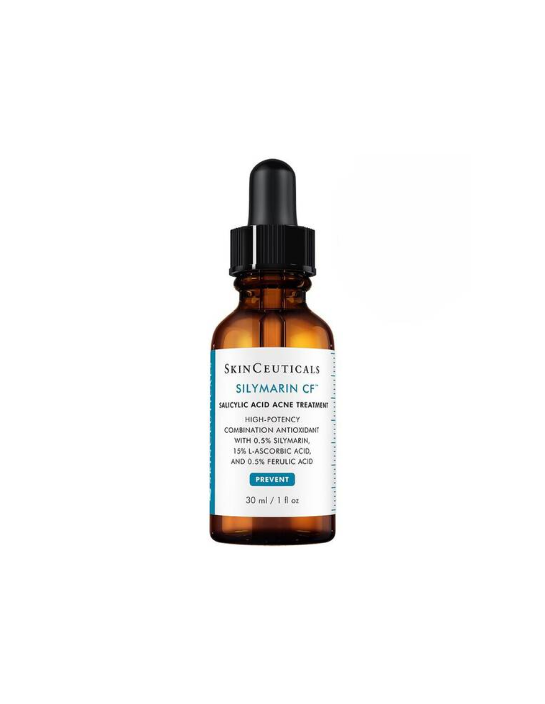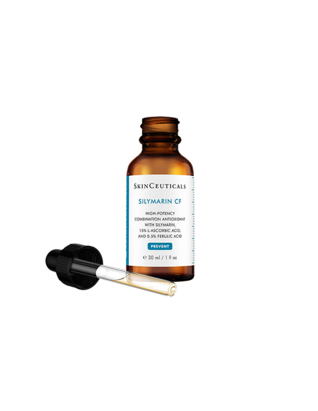 SkinCeuticals Silymarin CF es un sérum antioxidante oil-free con 15% de vitamina C pura (ácido L-ascórbico), 0.5% de silimarina (extracto de cardo mariano), 0.5% de ácido ferúlico y 0.5% de ácido salicílico. Formulado específicamente para pieles grasas y con tendencia acnéica, reduce la oxidación del sebo (-76%), minimiza los poros, las imperfecciones y las líneas finas, y previene el envejecimiento prematuro causado por radicales libres ambientales. Mejora la textura, aporta claridad y luminosidad, y refuerza la barrera cutánea. Clínicamente probado: reduce el sebo y brillos desde la primera semana. Textura fluida de rápida absorción, sin residuo graso. Ideal como primer paso antiedad en rutinas para pieles mixtas/grasas adultas.