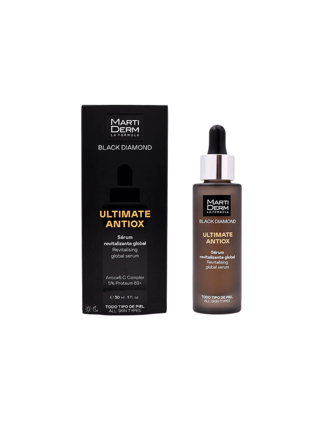 MARTIDERM Black Diamond Ultimate Antiox Sérum contiene: Aqua (Water), Propanediol, Ascorbyl Glucoside, Dimethicone, Butylene Glycol, Glycerin, Tocopheryl Acetate, Potassium Hydroxide, PEG-35 Castor Oil, Trehalose, Microcrystalline Cellulose, Glutathione, Isomerized Linoleic Acid, Pullulan, Sphingomonas Ferment Extract, Tricholoma Matsutake Extract, Terminalia Ferdinandiana Fruit Extract, Hydrolyzed Sodium Hyaluronate, Cellulose Gum, Haematococ -cus Pluvialis Extract, Astaxanthin, Ergothioneine, Aspergillus Ferment, Phosphatidylcholine, Glycine Max (Soybean) Polypeptide, Lecithin, Silica, Citric Acid, Tocopherol, Phytic Acid, Beta-Sitosterol, Squalene, PEG-40 Hydrogenated Castor Oil, Caprylyl Glycol, Xanthan Gum, Sclerotium Gum, Disodium EDTA, Potassium Chloride, Parfum (Fragrance), Phenoxyethanol, Potassium Sorbate, Sodium Benzoate. Esta composición no comedogénica y sin parabenos asegura una protección antioxidante, hidratación profunda y un efecto rejuvenecedor, ideal para pieles maduras o exigentes.