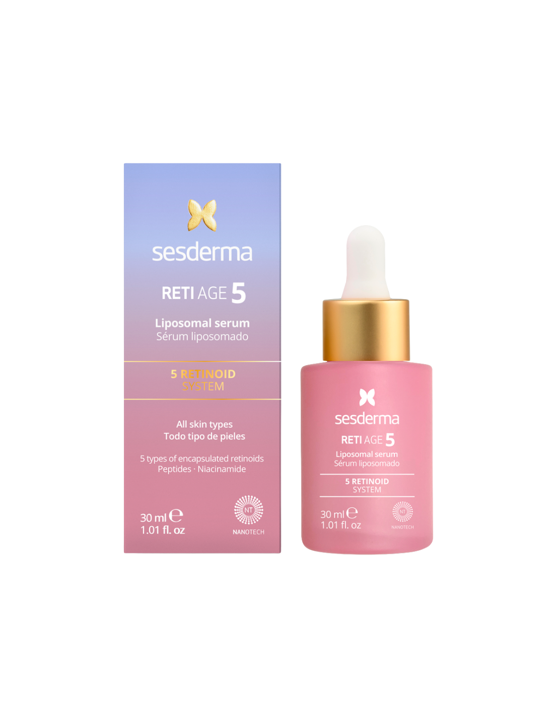 SESDERMA Reti Age 5 Sérum Liposomado es un tratamiento antiedad avanzado que combina la innovación de 5 tipos de retinoides encapsulados para transformar visiblemente la piel y combatir los signos del envejecimiento con la máxima eficacia y tolerancia. Permite que los activos penetren de forma controlada y profunda, ofreciendo cinco beneficios esenciales: renovar la piel, reducir arrugas y líneas de expresión, rellenar desde el interior, rehidratar intensamente y reforzar la estructura cutánea. Mejora la firmeza y elasticidad, dejando la piel más lisa, luminosa y con un tono uniforme. Su fórmula equilibrada lo convierte en el sérum ideal incluso para pieles sensibles o que se inician en el uso de retinoides, aportando resultados visibles sin irritación.
