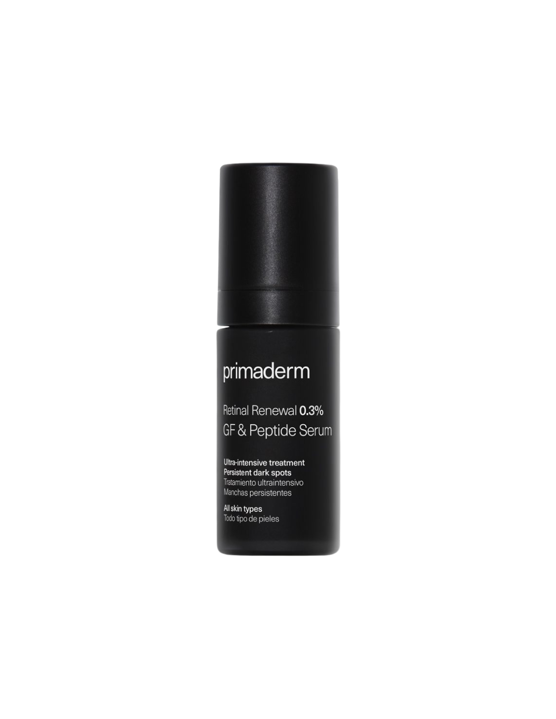 PRIMADERM Retinal Renewal 0.3% GF & Peptide Serum es un sérum antiedad intensivo de alta potencia concebido para la renovación cutánea profunda y la mejora global de la piel madura o con signos visibles de envejecimiento. Su fórmula incorpora retinal puro encapsulado para estimular la renovación celular y la síntesis de colágeno, acompañado de péptidos y factores de crecimiento que actúan de forma sinérgica para mejorar la densidad, firmeza y textura de la piel. Este tratamiento apunta a reducir arrugas, líneas finas, manchas e irregularidades del tono, al mismo tiempo que potencia la luminosidad y unifica el aspecto general de la piel. Favorece una mejor tolerancia al retinal, minimizando riesgos de irritación típicos de los retinoides y promoviendo una piel más tersa y suave.