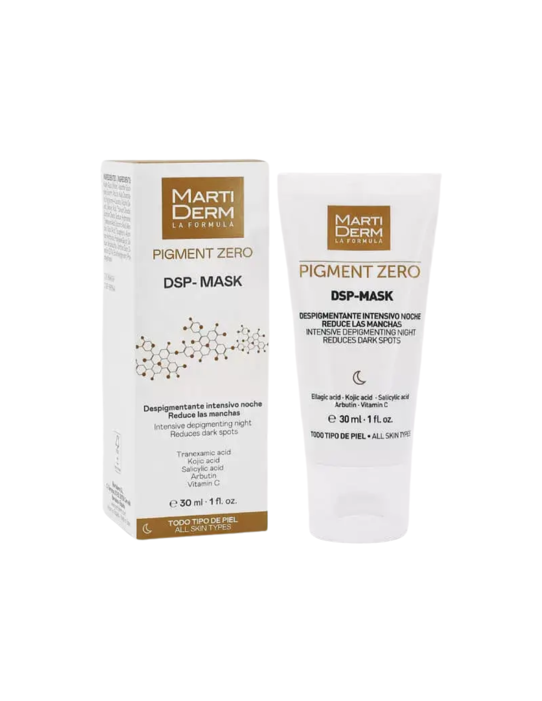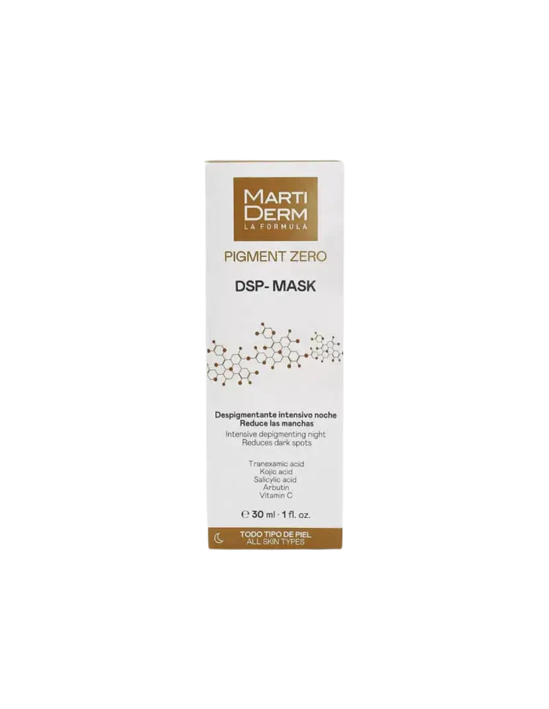 MARTIDERM Pigment Zero DSP-Mask contiene: Kaolin, Aqua (Water), Ascorbyl Glucoside, Glycerin, Arbutin, Kojic Dipalmitate, Polyglyceryl-4 Laurate, Alcohol Denat., Salicylic Acid, Titanium Dioxide, Sorbitan Oleate, Sodium Hydroxide, Tranexamic Acid, Succinic Acid, Menthol, Citric Acid, Tocopherol, Aluminum Hydroxide, Propylene Glycol, Sodium Metabisulfite, Xanthan Gum, Disodium EDTA, Ethylhexylglycerin, Phenoxyethanol.