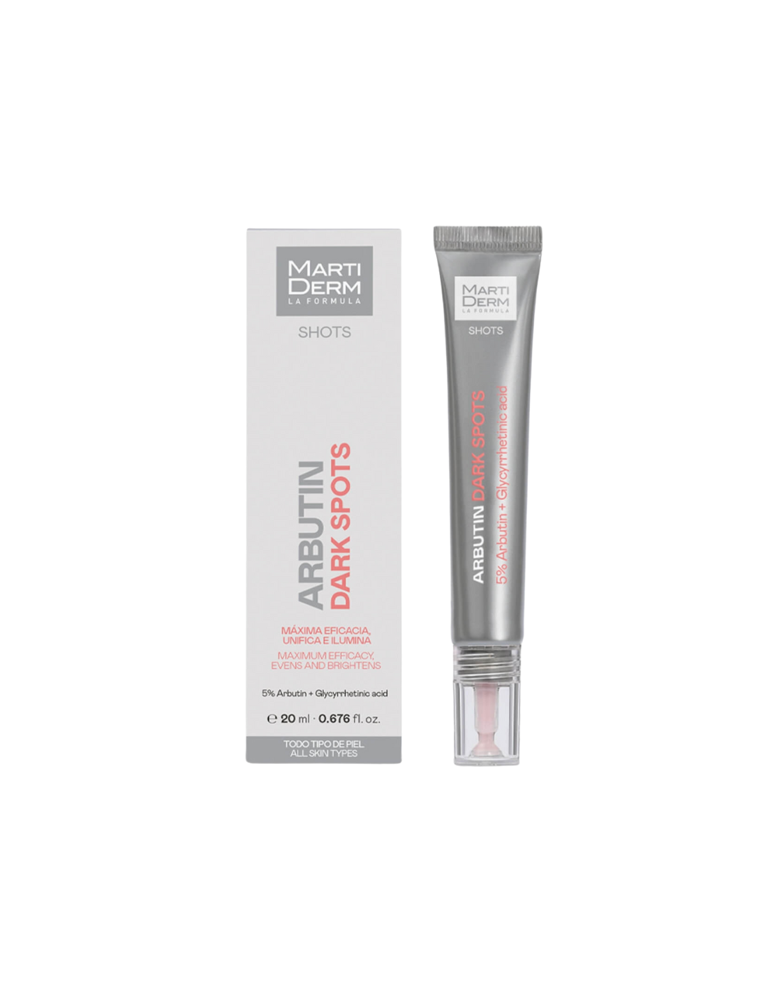MARTIDERM Shots Arbutin Dark Spots es un sérum despigmentante intensivo diseñado para reducir manchas oscuras, hiperpigmentación y unificar el tono de la piel, ideal para pieles con manchas solares, melasma o marcas post-acné. Este tratamiento inhibe la producción de melanina, ilumina la piel y mejora su textura, ofreciendo resultados visibles en pocas semanas. Su textura ligera y no grasa se absorbe rápidamente, siendo apto para todo tipo de pieles, incluidas las sensibles. Este envase es perfecto para una rutina diaria que corrige las manchas y aporta luminosidad, ideal para rostro, cuello, escote y manos.