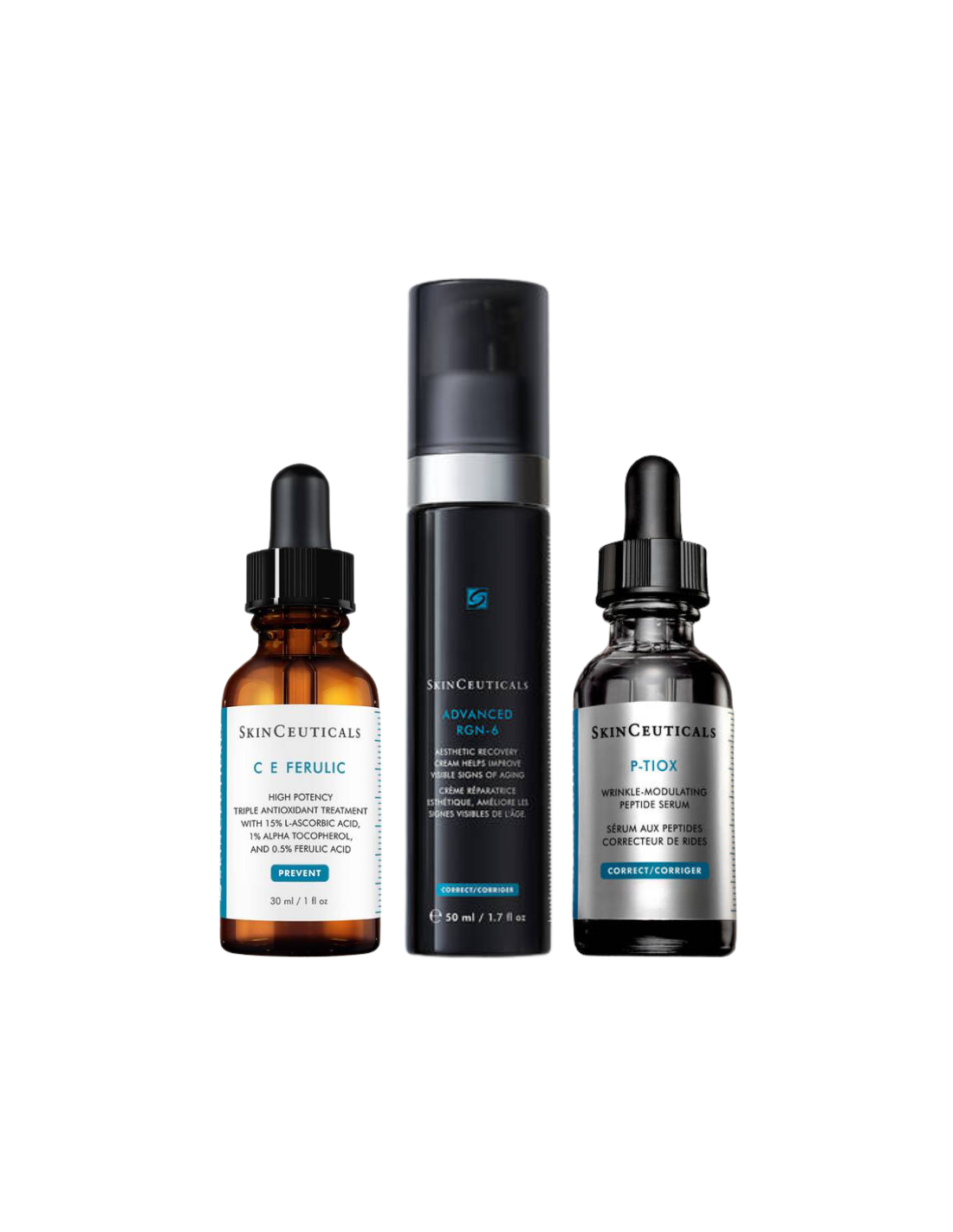 Este pack incluye el CE Ferulic Sérum Antioxidante 30 ml, un concentrado potente que neutraliza radicales libres y potencia el colágeno, la Advanced RGN-6 50 ml, una crema regeneradora que corrige las 6 dimensiones del envejecimiento con péptidos y extractos botánicos para reafirmar y revitalizar, y el regalo P-Tiox Sérum 15 ml, un sérum tensor que modula la expresión muscular para rellenar líneas finas.