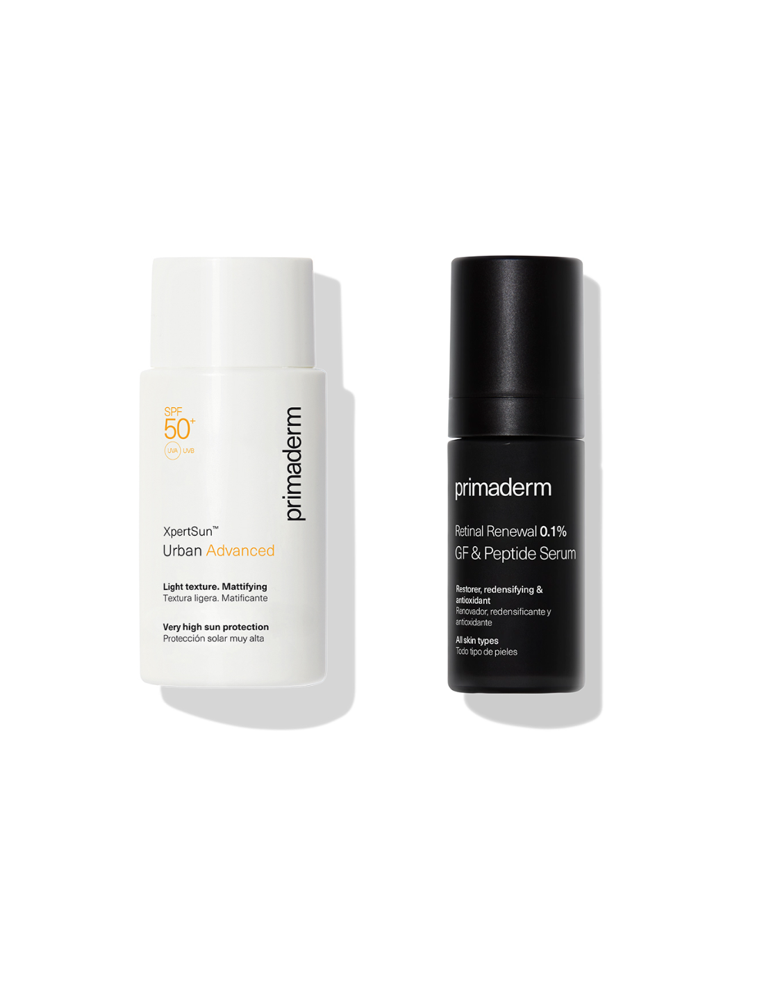 Primaderm Pack es un conjunto de cuidado facial que combina un potente sérum antiedad con un protector solar avanzado, diseñado para rejuvenecer y proteger la piel de manera integral. El Retinal Renewal 0,1% es un tratamiento nocturno con retinal puro encapsulado que reduce arrugas, mejora la firmeza y renueva la textura cutánea, ideal para pieles que buscan un efecto antienvejecimiento visible. Por su parte, el XPERTSUN Urban Advanced Light Texture SPF 50+ ofrece una protección solar diaria de amplio espectro contra rayos UVB/UVA, polución y radicales libres, con una textura ultraligera que deja un acabado mate, perfecto como base de maquillaje. Este pack es ideal para quienes desean una rutina completa de regeneración y defensa diaria.