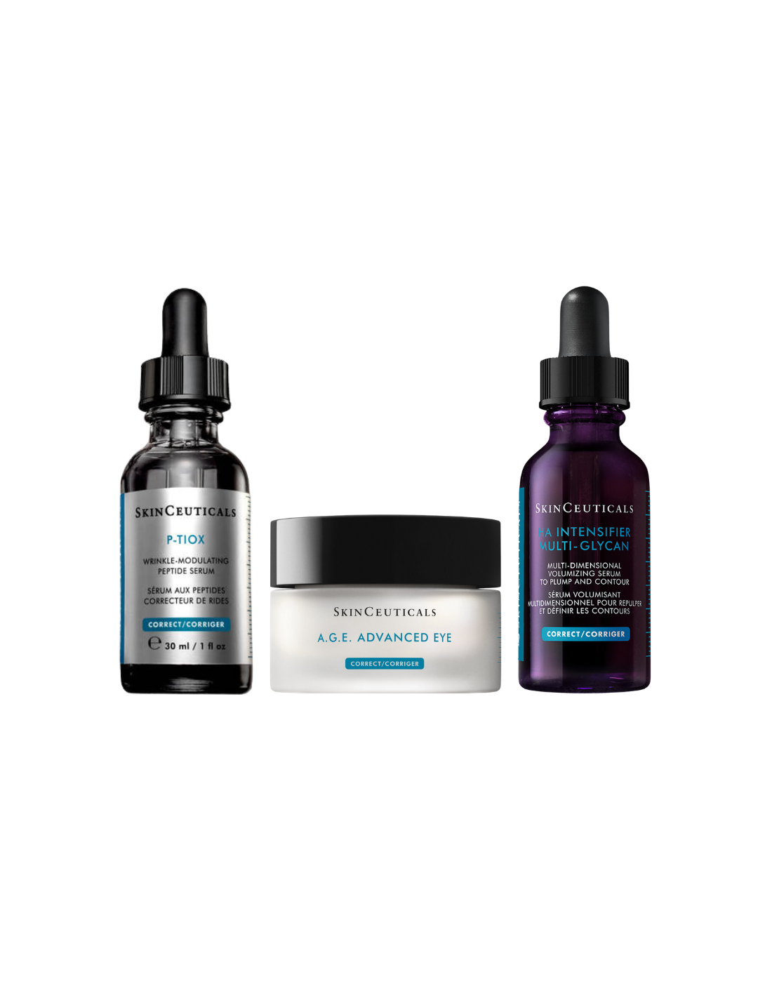 SkinCeuticals Pack Protocolo Arrugas y Glass Skin es un tratamiento antiedad premium diseñado para reducir arrugas de expresión, reafirmar la piel y lograr un efecto glass skin luminoso y terso, ideal para adultos con pieles maduras o sensibles que buscan una rutina integral para combatir líneas finas, ojeras y pérdida de vitalidad cutánea con resultados visibles desde la primera semana. Este pack incluye el P-Tiox Sérum 30 ml, un concentrado tensor que modula la expresión muscular para rellenar arrugas dinámicas, el A.G.E. Advanced Eye 15 ml, una crema contorno de ojos que corrige ojeras, bolsas y arrugas perioculares, y el regalo HA Intensifier 15 ml, un sérum multi-hidratante que rellena y restaura la elasticidad con tres pesos moleculares de ácido hialurónico.