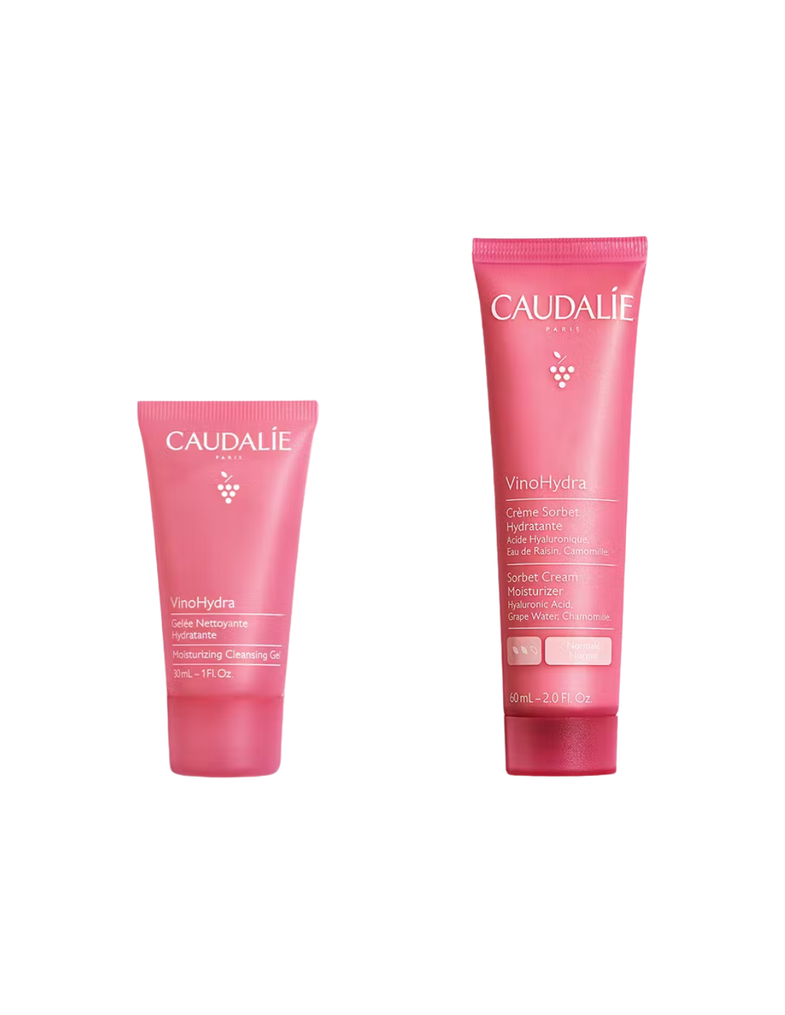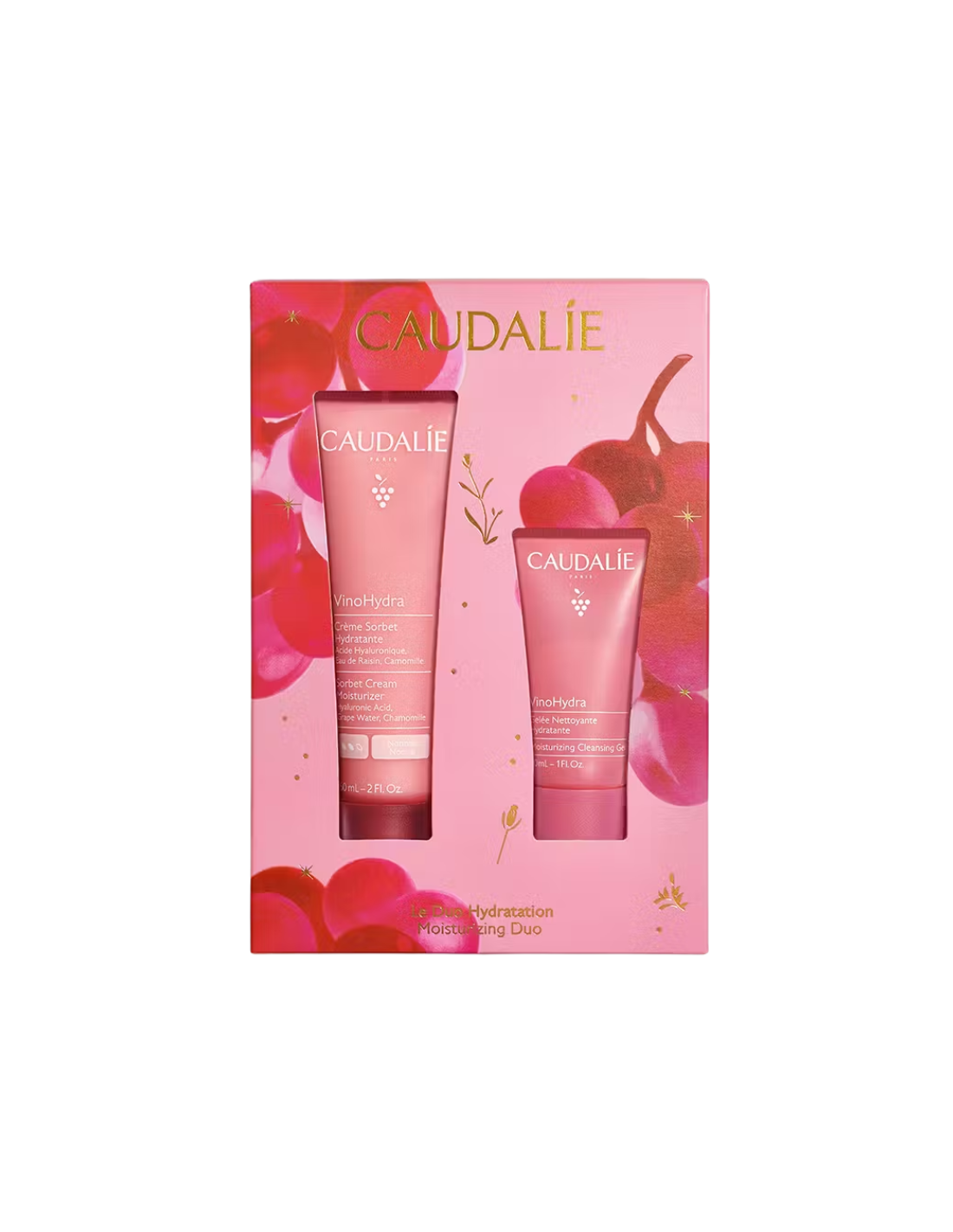 CAUDALIE Cofre Dúo Hidratación VinoHydra es un estuche edición limitada con Crema Sorbete Hidratante 60 ml y Gelatina Limpiadora Hidratante 30 ml (formato viaje), formulado al 97% con ingredientes naturales para pieles normales, secas y sensibles. Hidrata intensamente, calma rojeces y tirantez causadas por sequedad, y fortalece la barrera cutánea con agua de uva bio, ácido hialurónico 100% natural y camomila suavizante. La tecnología “quick break” transforma la crema en un parche de agua que hidrata y alivia al instante, mientras la gelatina limpia sin agredir. Resultados clínicos: 90% piel calmada, 77% menos rojeces (estudio en 22 voluntarios, 28 días). Vegana, eco-diseñada y sin plásticos, ideal para rutinas diarias que restauran vitalidad y luminosidad.