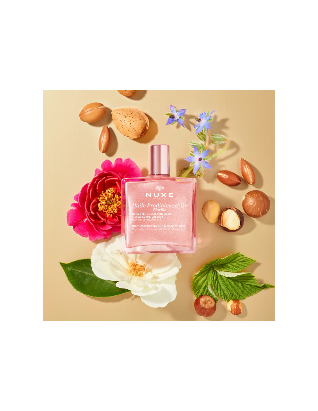 NUXE Huile Prodigieuse Or Florale 10 ml: 7 aceites preciosos 100% vegetales con propiedades complementarias, seleccionados por su afinidad con la piel: Aceite de tsubaki, Aceite de argán, Aceite de macadamia, Aceite de borraja, Aceite de camelia, Aceite de avellana, Aceite de almendra dulce.