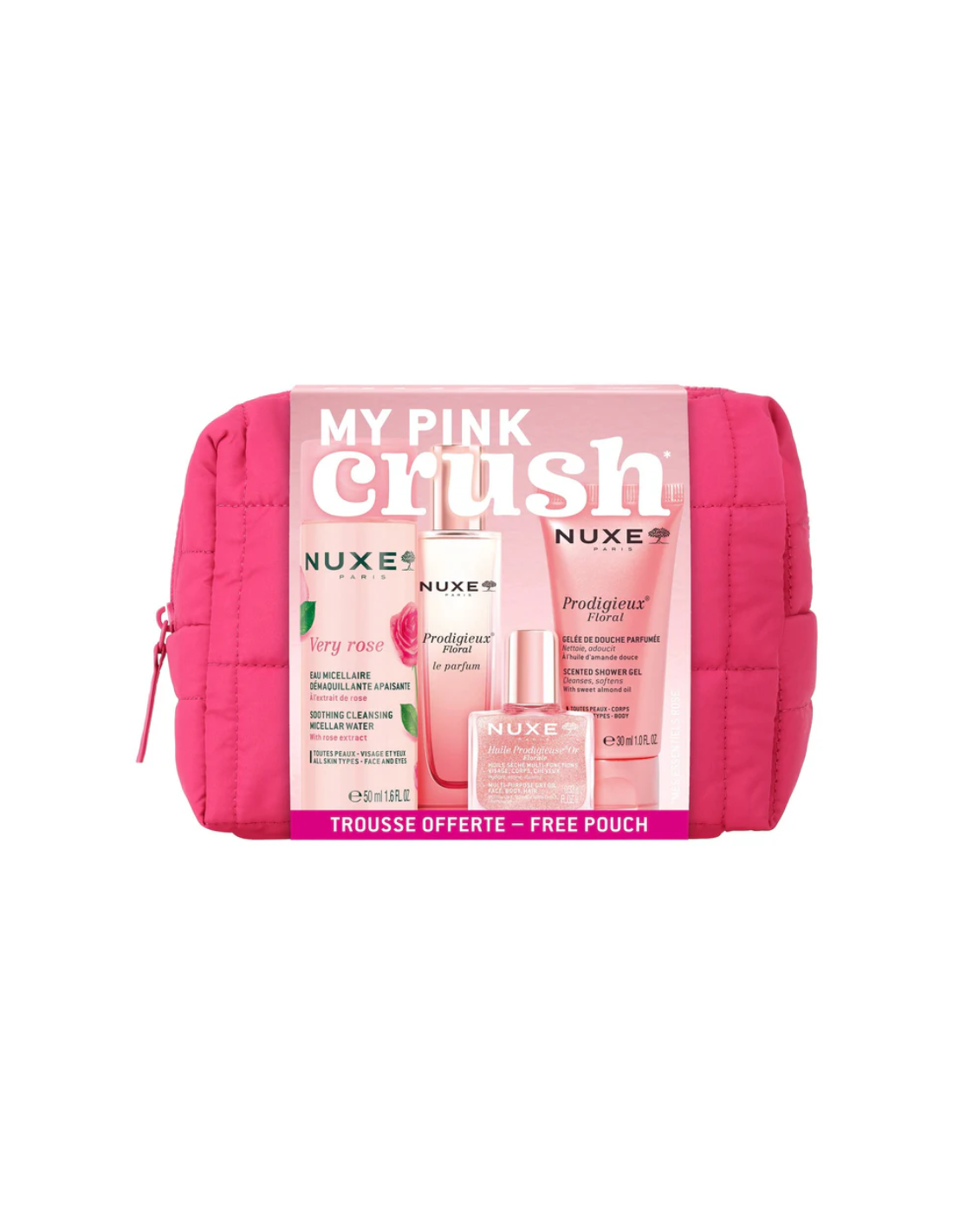 NUXE Pack My Pink Crush es un completo set de belleza con aroma floral diseñado para limpiar, hidratar, iluminar y perfumar la piel en una rutina diaria sensorial y eficaz. Este pack reúne varios productos icónicos en formato práctico que combinan activos de origen natural y texturas ligeras para aportar frescura, suavidad y luminosidad al rostro, cuerpo y cabello. Su fragancia floral delicada con notas de rosa y matices frescos convierte cada aplicación en una experiencia placentera, ideal tanto para el cuidado diario como para llevar de viaje gracias a su formato compacto.