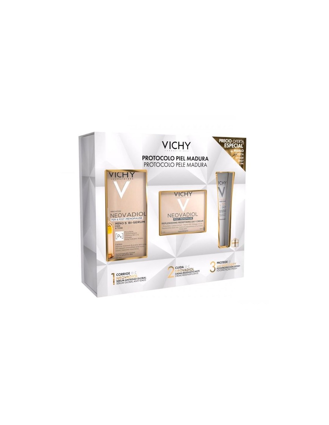 VICHY Cofre N24 Xmas Neovadiol es un exclusivo set de cuidado diseñado para pieles maduras, especialmente aquellas afectadas por los cambios hormonales de la menopausia. Este cofre incluye el Meno 5 Bi-Serum (30 ml), un potente sérum que combate la sequedad, flacidez y pérdida de densidad, la Crema de Día Nutritiva Antiflacidez (50 ml), que hidrata intensamente y fortalece la piel, y el Fotoprotector UV-Age Daily SPF 50+ (15 ml), que ofrece alta protección solar contra el envejecimiento por exposición a los rayos UVA y UVB. Este cofre es ideal para restaurar la firmeza y la hidratación en la piel madura, aportando una apariencia rejuvenecida y protegida.