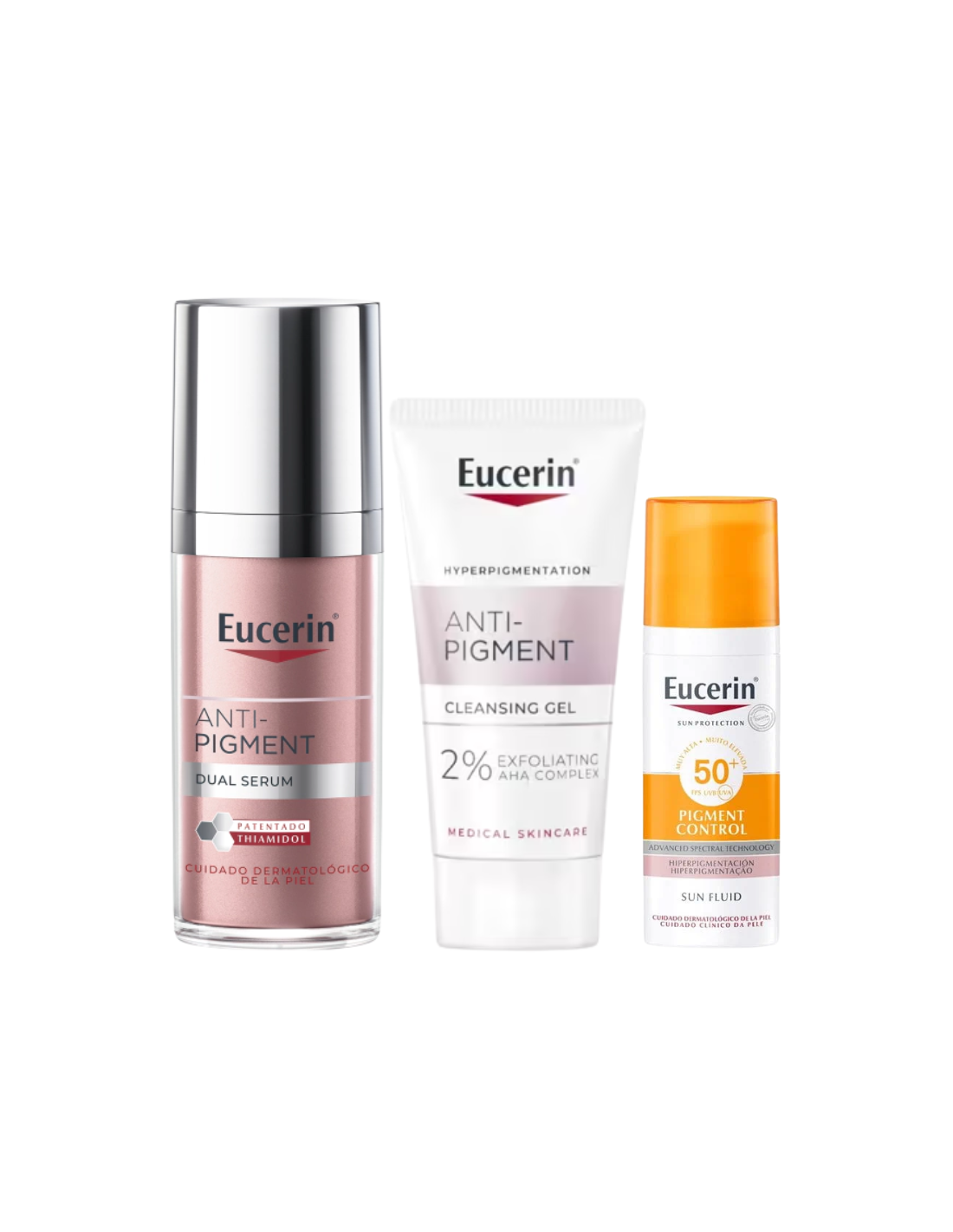 EUCERIN Pack Antimanchas es una solución integral para combatir las manchas oscuras y lograr una piel uniforme y radiante, ideal para todo tipo de pieles, incluidas las sensibles. Este pack incluye el Anti-Pigment Dual Serum 30 ml que reduce eficazmente las manchas hiperpigmentadas y previene su reaparición; el Anti-Pigment Gel Limpiador 20 ml que limpia suavemente y mejora la claridad de la piel; y el Sun Protection Pigment Control FPS 50+ 7 ml, que protege contra rayos UVA/UVB y previene la formación de nuevas manchas. Perfecto para tratar hiperpigmentación causada por el sol, envejecimiento o factores hormonales, este pack combina limpieza, tratamiento y protección solar para una rutina completa que promueve una piel luminosa y uniforme.