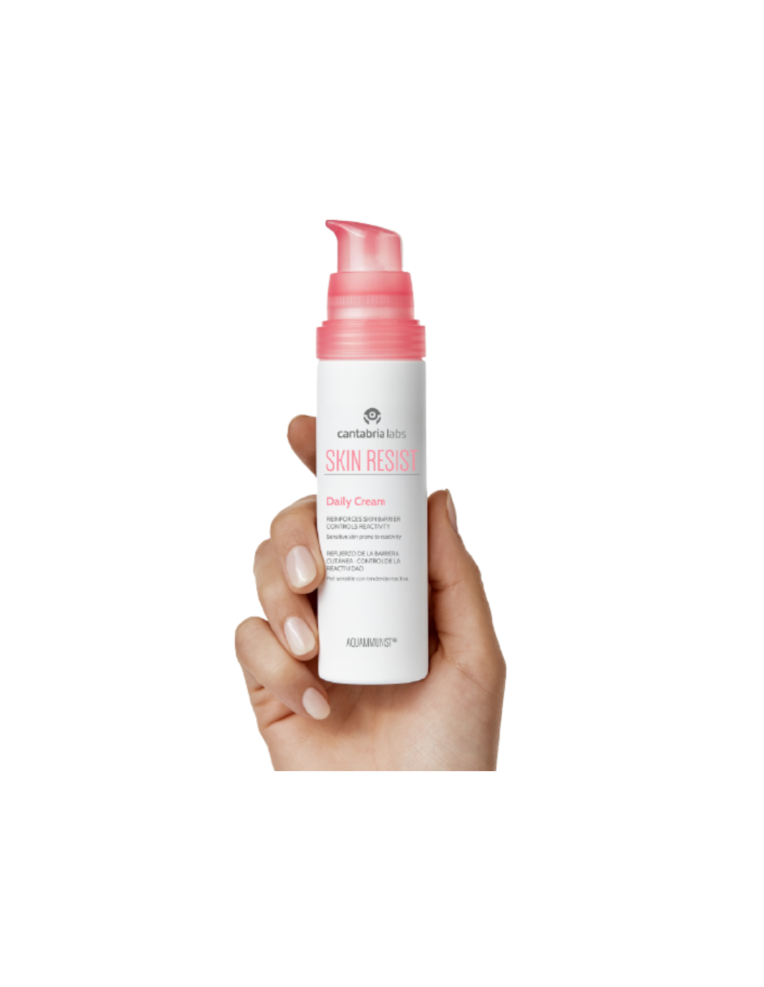 SKIN RESIST Daily Cream incluye niacinamida (fortalece barrera cutánea), extracto de chirimoya (Annona Cherimola Fruit Extract) (calmante y protector), tecnología Aquammunist® (patentada para equilibrio barrera y control reactividad), escualano y manteca de karité (nutrición e hidratación profunda). Con un 93% de origen natural, sin fragancia añadida para máxima tolerancia. Revisa el envase para ver la lista INCI completa y las alertas alérgicas.