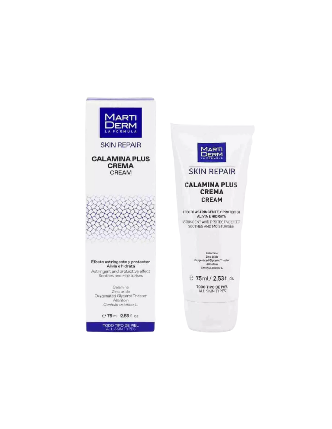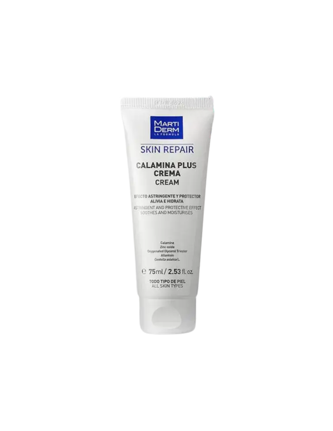 MARTIDERM Skin Repair Calamina Plus Crema es una crema protectora y regeneradora especialmente formulada para aliviar la piel sensible, irritada o dañada. Su contenido en calamina y óxido de zinc le aporta propiedades astringentes, calmantes y protectoras, ideales para tratar rojeces, picores, irritaciones por sudor o humedad y eritema solar. Ayuda a regenerar la piel, manteniéndola seca, protegida y confortable, incluso en zonas delicadas o con tendencia a la irritación.