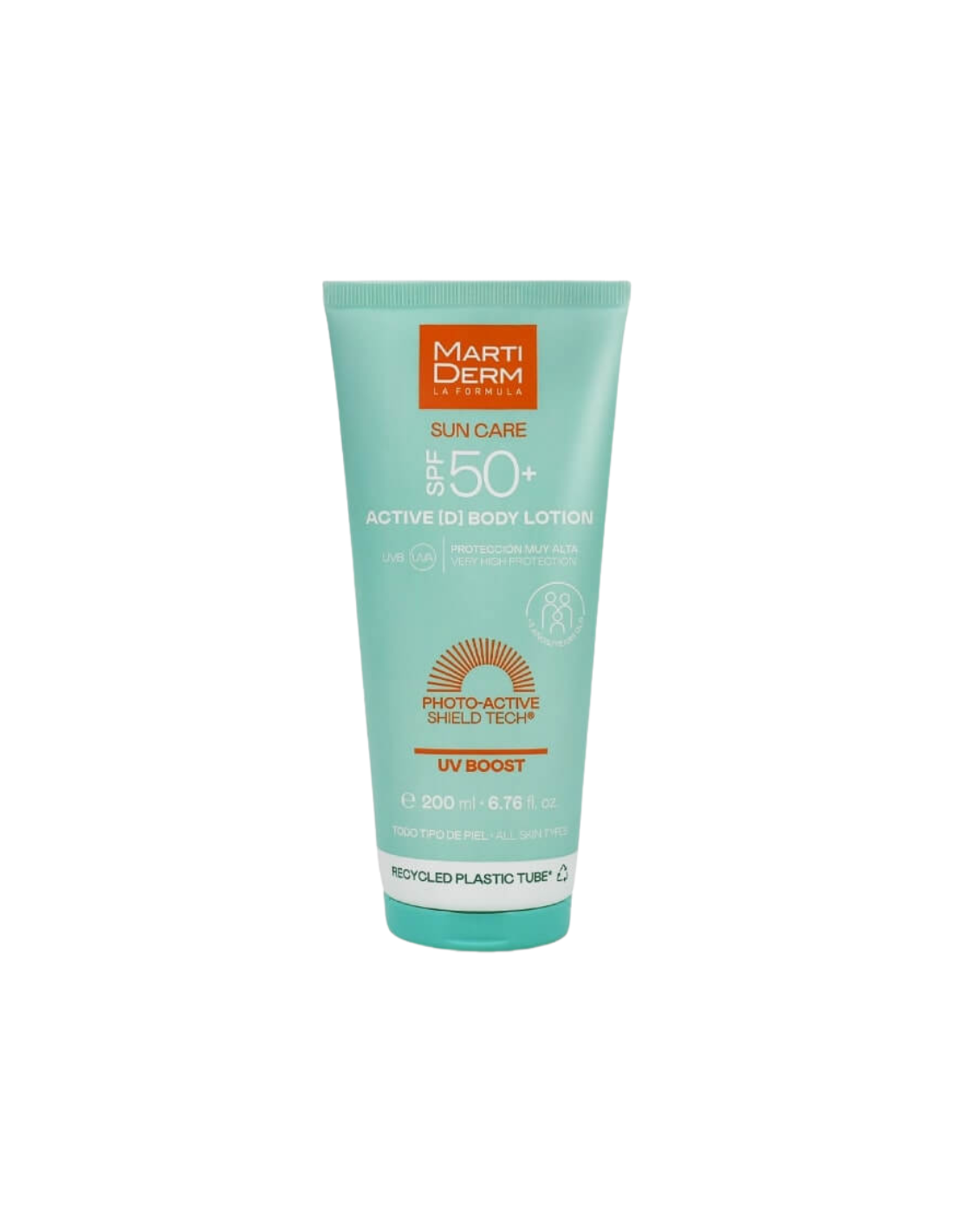 MARTIDERM Sun Care SPF50+ Active [D] Body Lotion es un protector solar corporal de alta protección diseñado para ofrecer una defensa eficaz contra los rayos UVA, UVB e infrarrojos, ideal para todo tipo de pieles, incluidas las sensibles. Su fórmula avanzada con tecnología Photo-Active Shield® optimiza la protección SPF al contacto con los rayos UV, mientras que ingredientes hidratantes y antioxidantes cuidan la piel, previniendo el fotoenvejecimiento y las quemaduras solares. Con una textura ligera, no grasa y resistente al agua, esta loción 'Sea Friendly' respeta los ecosistemas marinos, siendo perfecta para actividades al aire libre. Este envase es ideal para un cuidado solar diario o durante exposiciones prolongadas.