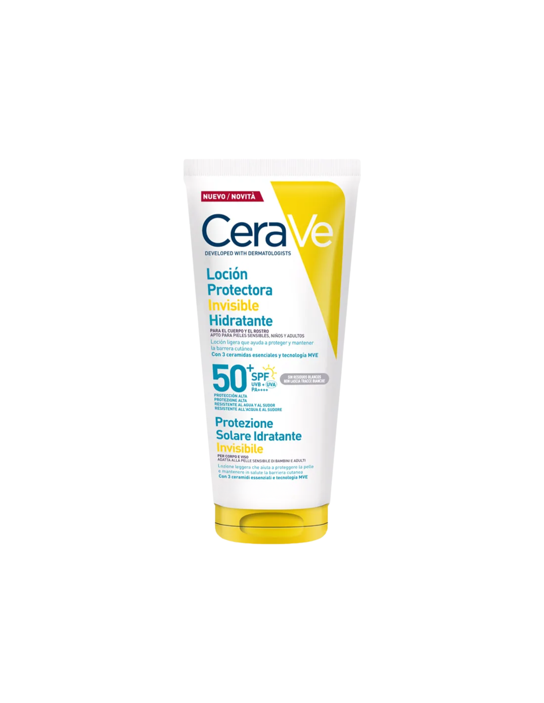 CeraVe Loción Protectora Invisible Hidratante SPF50+ contiene: AQUA/WATER, ISOPROPYL PALMITATE, ALCOHOL DENAT., ETHYLHEXYL SALICYLATE, ETHYLHEXYL TRIAZONE, BUTYL METHOXYDIBENZOYLMETHANE, BIS-ETHYLHEXYLOXYPHENOL METHOXYPHENYL TRIAZINE, GLYCERIN, PROPANEDIOL, DICAPRYLYL ETHER, OXIDIZED STARCH ACETATE, COPERNICIA CERIFERA CERA/CARNAUBA WAX, C12-22 ALKYL ACRYLATE/HYDROXYETHYLACRYLATE COPOLYMER, CERAMIDE NP, CERAMIDE AP, CERAMIDE EOP, CARBOMER, TRIETHANOLAMINE, CETEARYL ALCOHOL, BEHENTRIMONIUM METHOSULFATE, TRIETHYL CITRATE, SODIUM LAUROYL LACTYLATE, CHOLESTEROL, DROMETRIZOLE TRISILOXANE, TOCOPHEROL, CAPRYLYL GLYCOL, HYDROXYACETOPHENONE, TRISODIUM ETHYLENEDIAMINE DISUCCINATE, XANTHAN GUM, PHYTOSPHINGOSINE, ACRYLATES COPOLYMER, ACRYLATES/C10-30 ALKYL ACRYLATE CROSSPOLYMER, BENZOIC ACID.